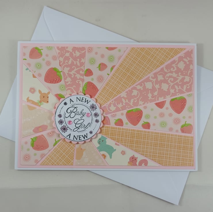 A6 new baby girl card, with a sunburst style background. The background has been created from multiple, coordinating pink/baby themed papers. The sentiment ' A new baby girl' has been hand stamped and mounted onto a scalloped circle of pink card and embellished with two small pink gems.
