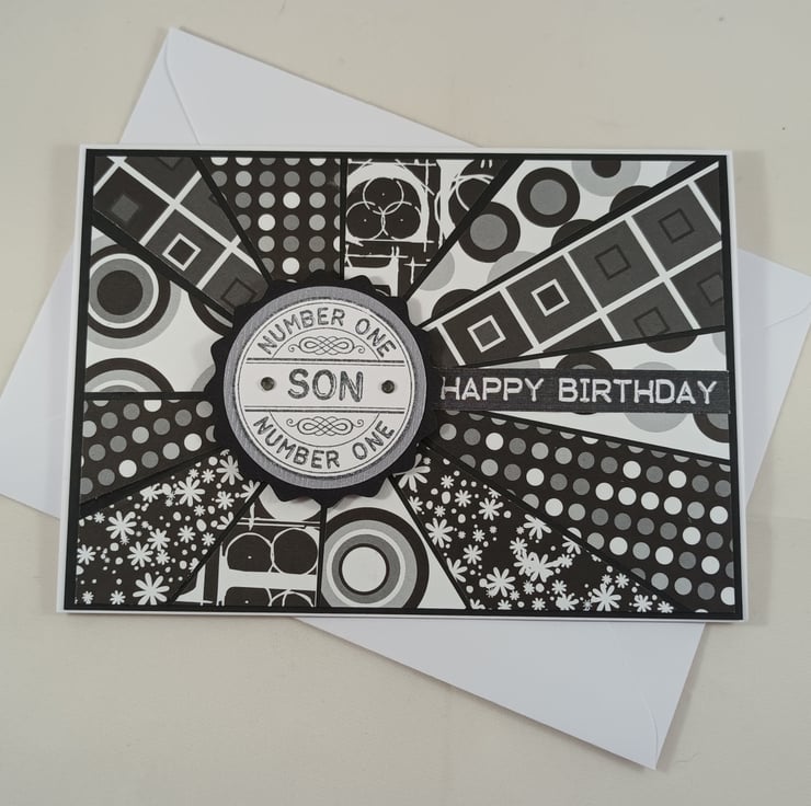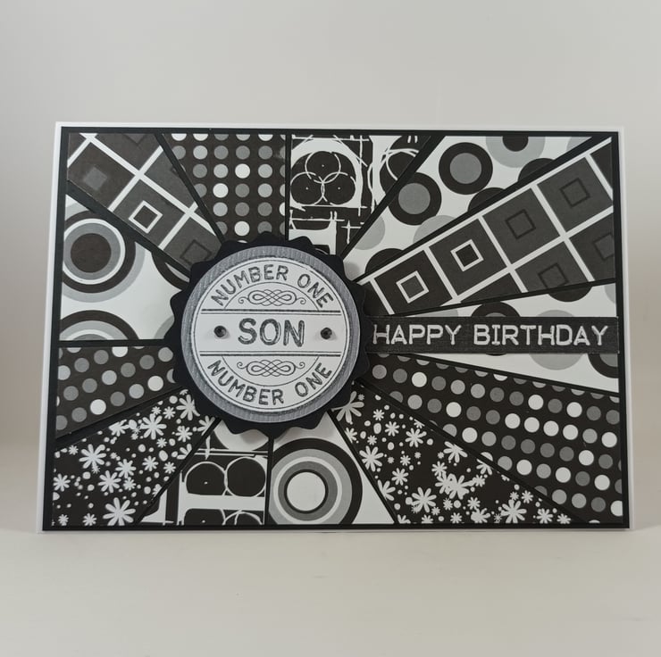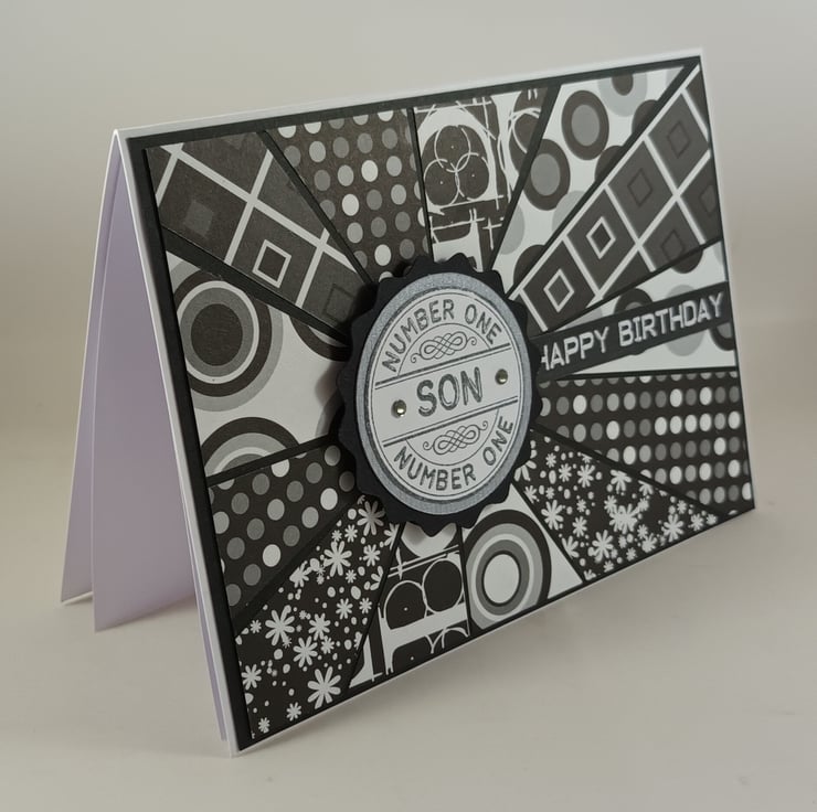 A6 birthday card for a favourite son, with a sunburst style background. The background has been created from multiple black/white/grey patterned papers. The sentiment ' Number One Son' has been mounted onto grey card and then a scalloped circle of black card and embellished with two small black gems. To the right of this is the printed sentiment 'Happy Birthday'.