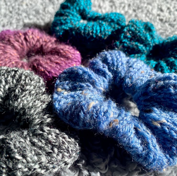 This listing is for a pack of 4 random Handmade Knitted Hair Scrunchies.