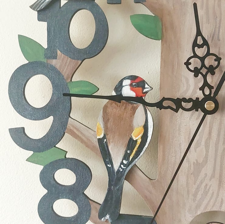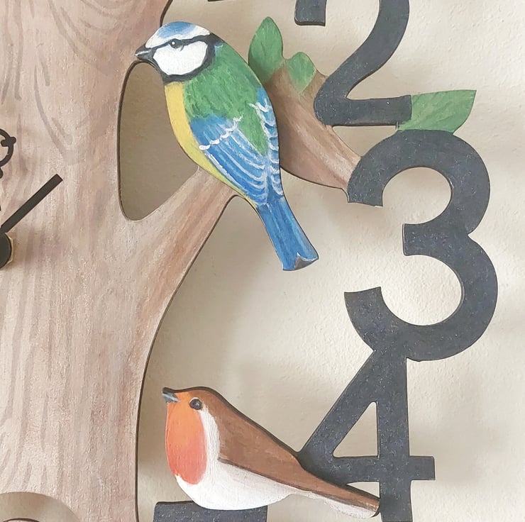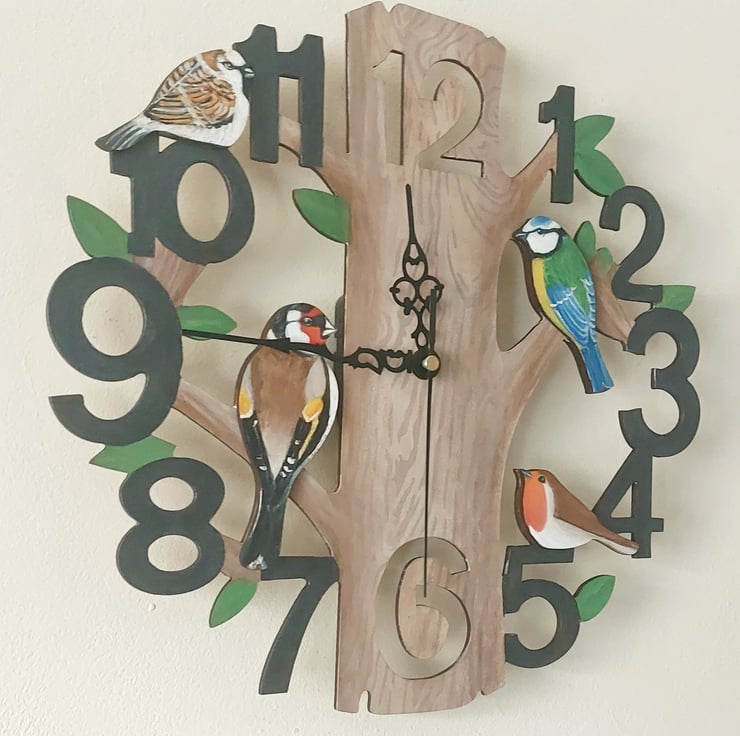 Handpainted garden bird wall clock. Made from mdf laser cut into the shape of tree trunk and branches. It is made of 2 layers the tree branches and 2nd layer are the birds. Each one individually handpainted so will not be exactly like the photo. There is a Robin, Goldfinch, sparrow and Blue tit. The clock has a silent mechanism and can be hung from it at the back.