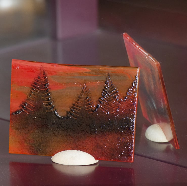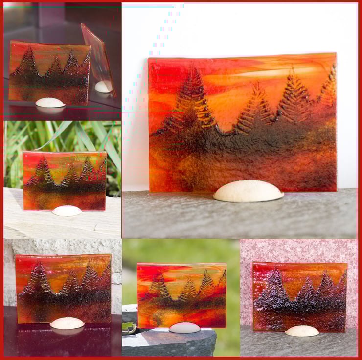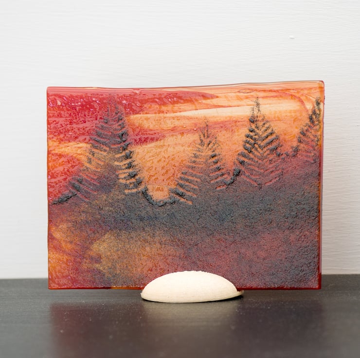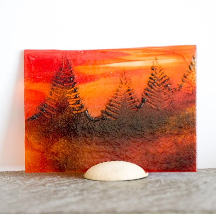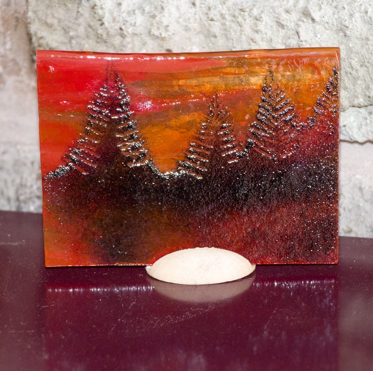 This piece uses a sheet of streaky red and clear glass, the top edge of which is uneven. The trees have been created using black glass powder, a very careful hand, and lots of heat from the kiln!