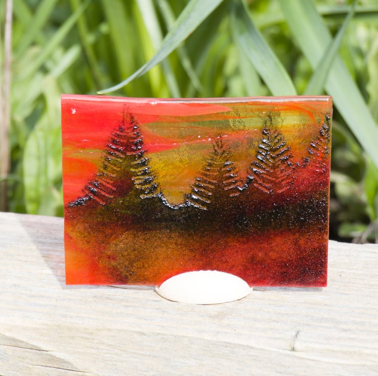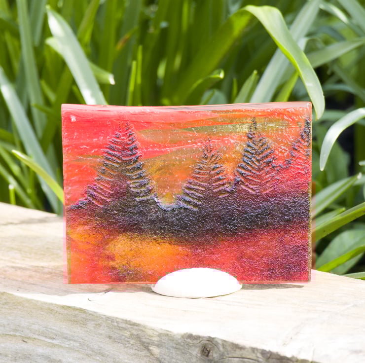 This unique and unusual piece of fused glass art depicts a small stand of trees silhouetted against a burning red evening sun.