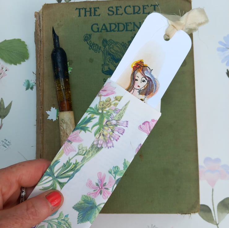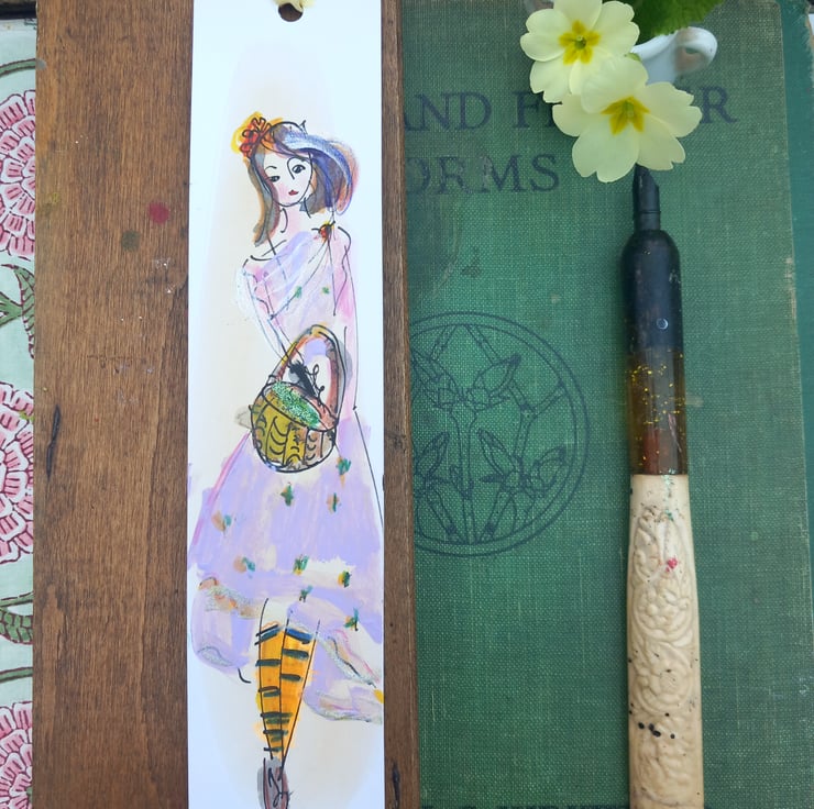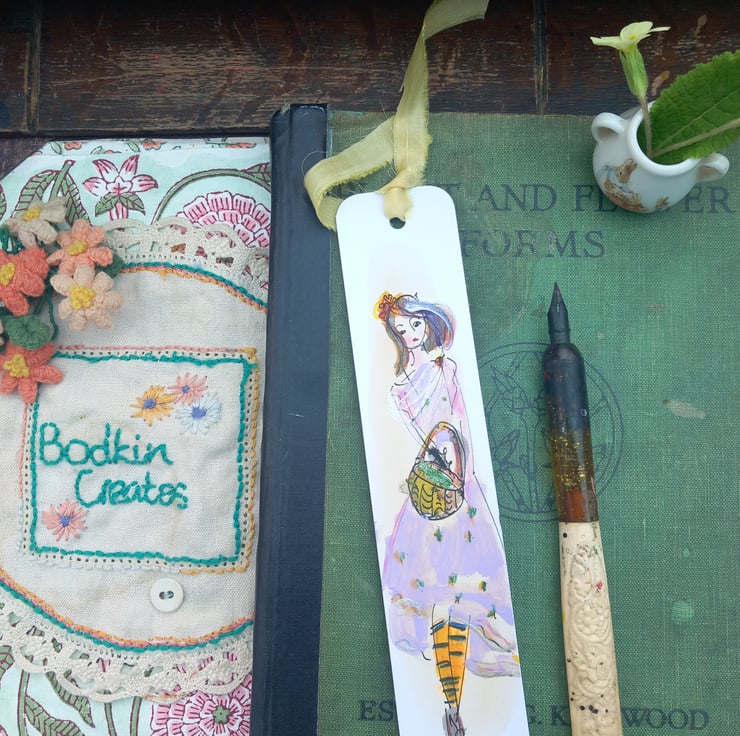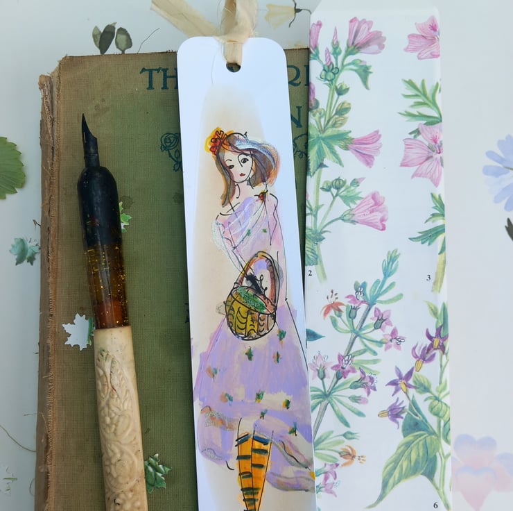 Hand drawn with ink and painted on beautiful quality card. All different and this one is a girl with her basket. I also add silk trims to the tops of my bookmarks x They come mindfully wrapped in thete own botanical handmade envelope. Love bodkin x