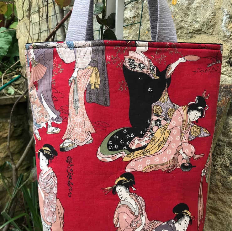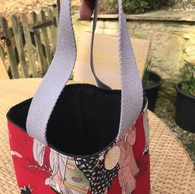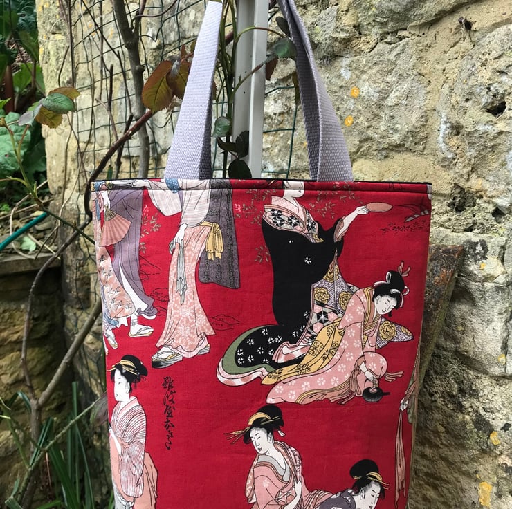 This is a lovely tote bag made from a Japanese print fabric and lined with black cotton . The size is approx 13 inches deep x 11.5 inches wide not including the handles .