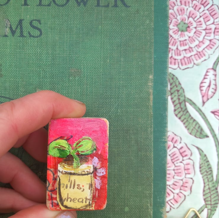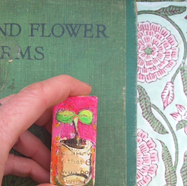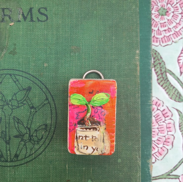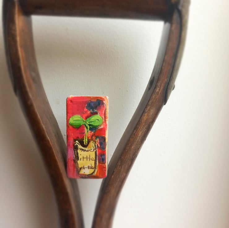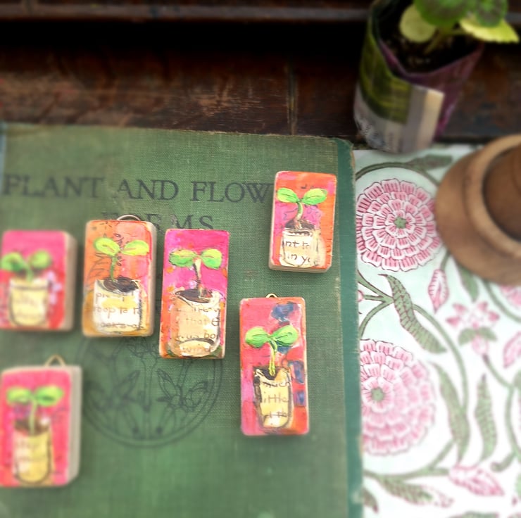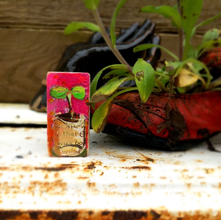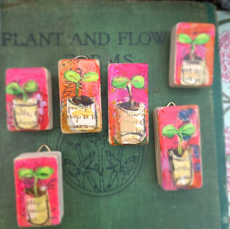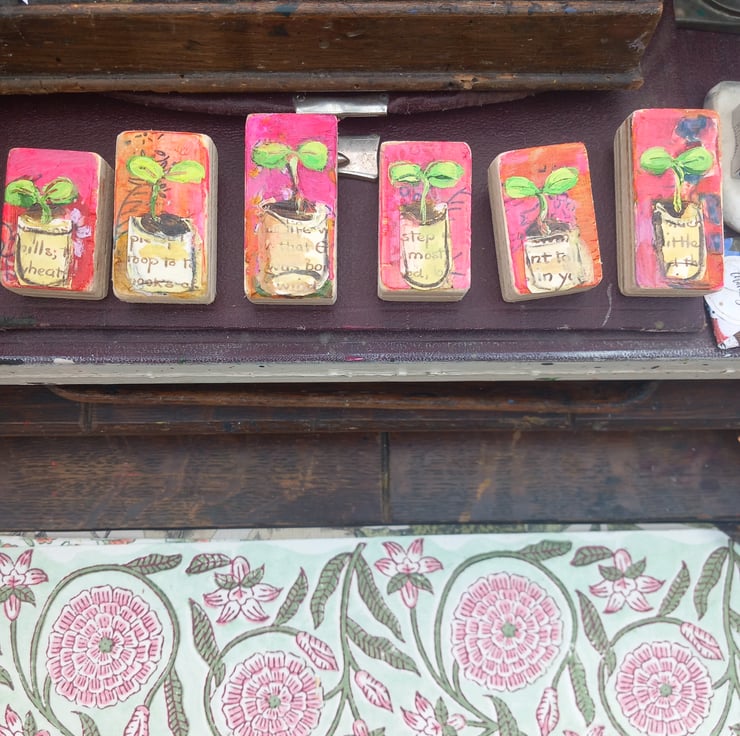 These are my little seedlings of hope and promise of spring. Hand painted, mixed media on small blocks of reclaimed wood. They have a little hook on the back but can also stand on a shelf. I have sanded the wood and give it a light varnish. Very sweet at 6 -7cm tall