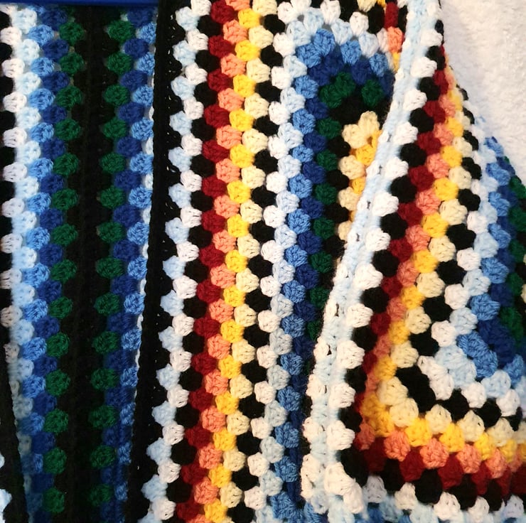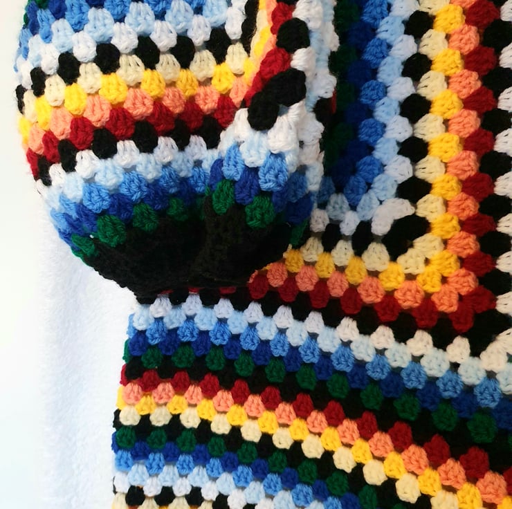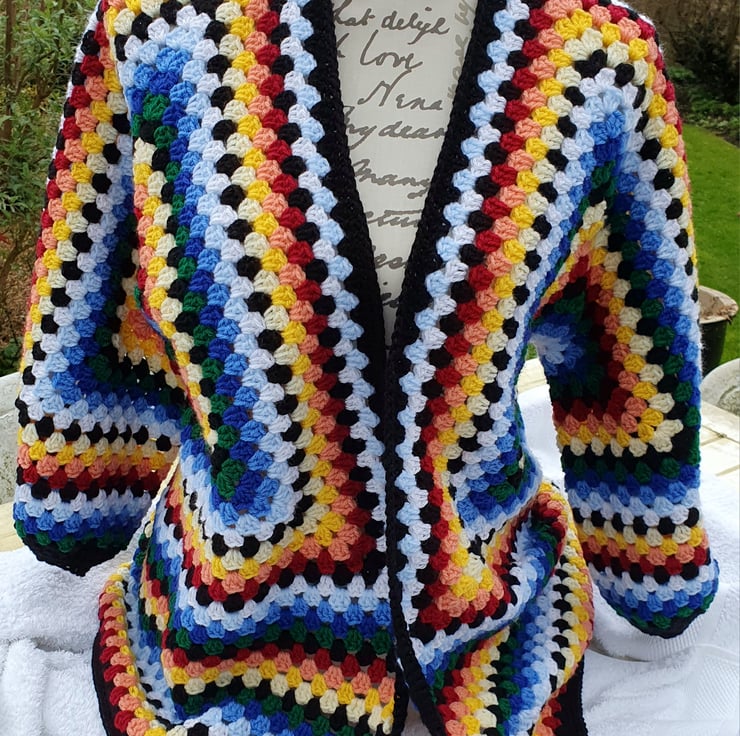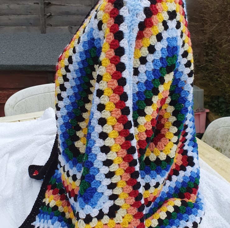 This Hexagon Cardigan has been crocheted using Multi Coloured 100% Acrylic Yarn, Machine washable at 30°. With long sleeves and a slightly longer length this Cardigan is ideal as we leave Winter and head into Spring, great for Cool days and chilly evenings. Given the different colours in this cardigan it can be worn with a variety of coloured shirts, tops, trousers, skirts and dresses.