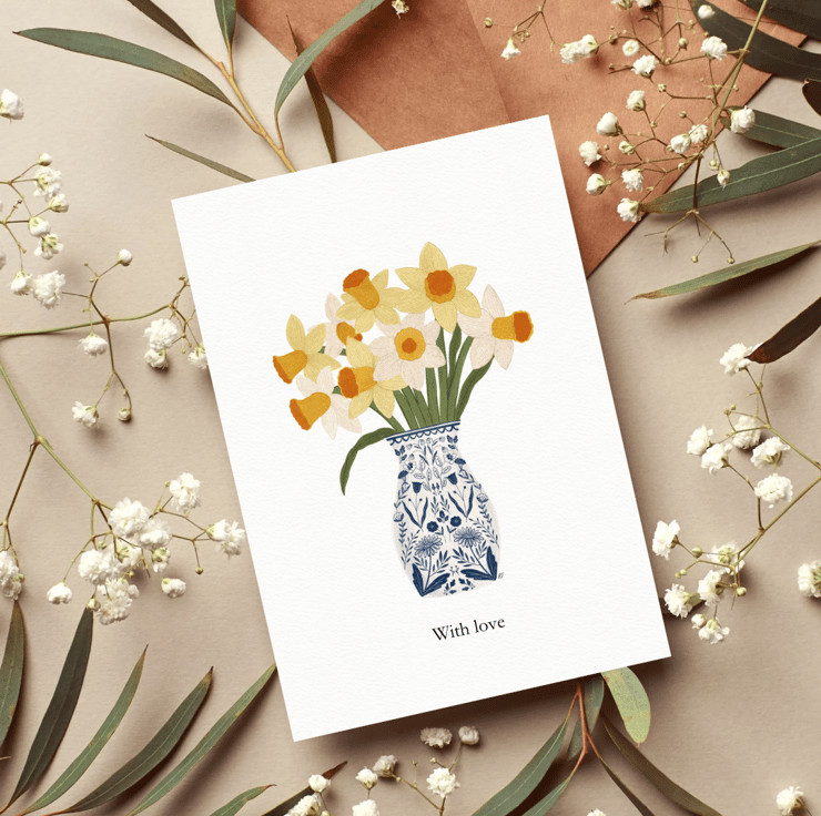 A beautiful card illustrated with Gouache, showcasing gorgeous Daffodils in a nice China porcelain vase.