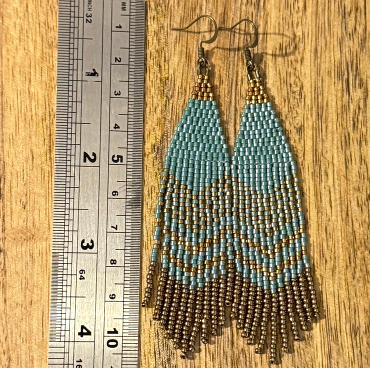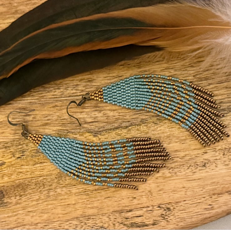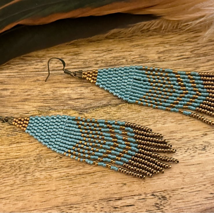These handmade earrings feature a Native American-inspired fringe design. The tiny glass beads have been handwoven in a double row to form a triangle shape in the colours of deep mallard blue/green and shimmering bronze.