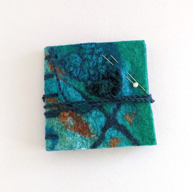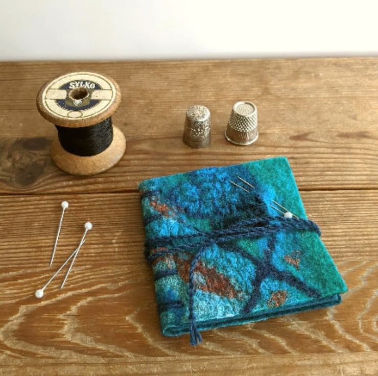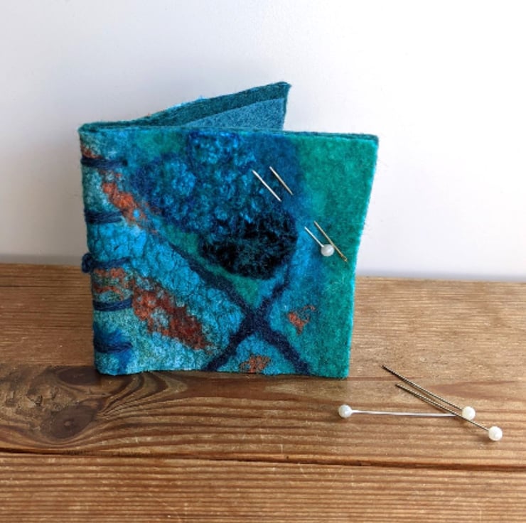 The handmade wet felted cover of teals and turquoise, with splashes of burnt orange, is embellished with upcycled fabric and silk fibres. The inner wool felt pages are firmly secured at the spine with toning lambswool, and wrapped with a handmade lambswool cord for closure, or to tie your scissors onto!