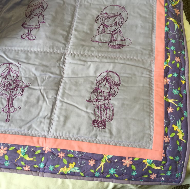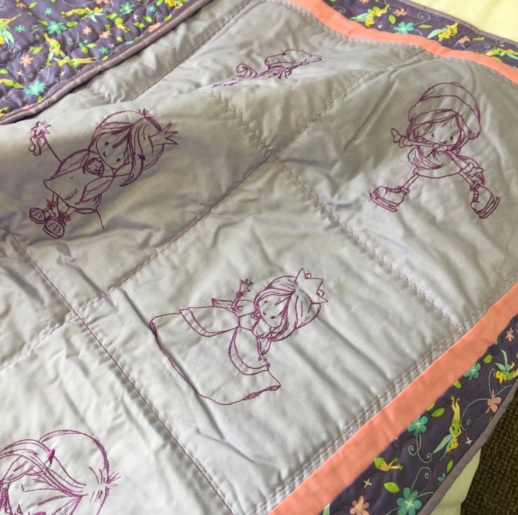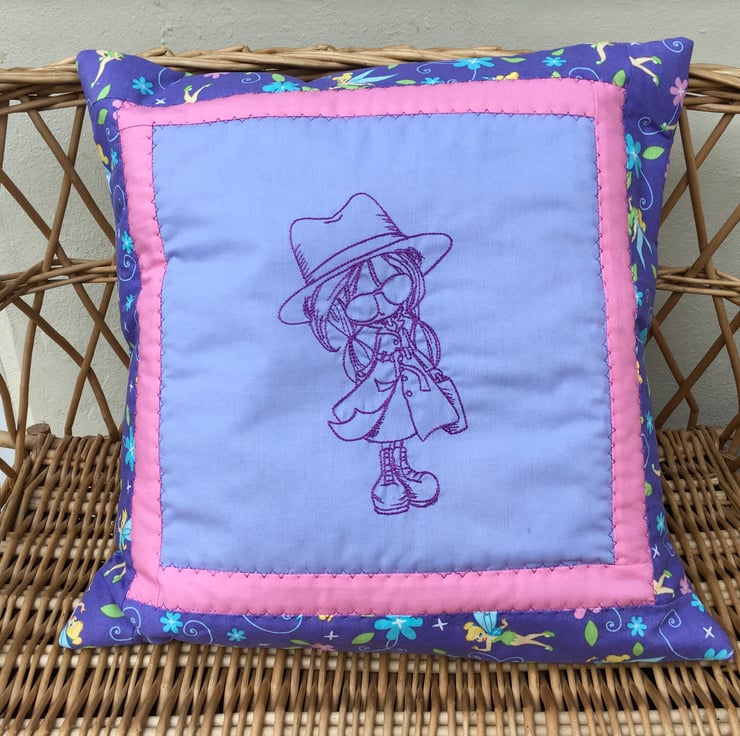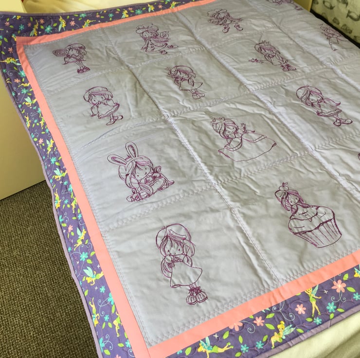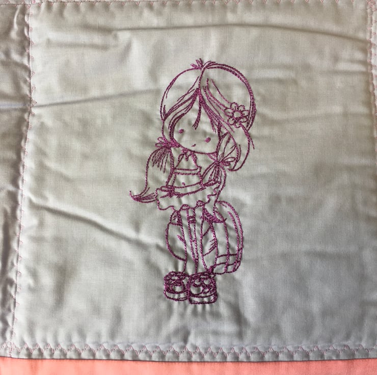 This soft and squashy quilt is a nice size for a bit older toddler and is embroidered with designs called Wren Girls. These picture blocks show funny girls, with a cat, fairy cake, hat, glasses and even a pogo stick! There’s plenty to look at. In purple stitching on a lilac background the last picture is the nearest in colour to the actual quilt as different light gave different results. It has a border and backing of a pretty fabric with fairies and flowers, is decorated with machine stitching and bound with deep lilac. It comes with a matching 16” cushion cover which is complete with cushion. The quilt measures 48” square and is machine washable at thirty degrees.