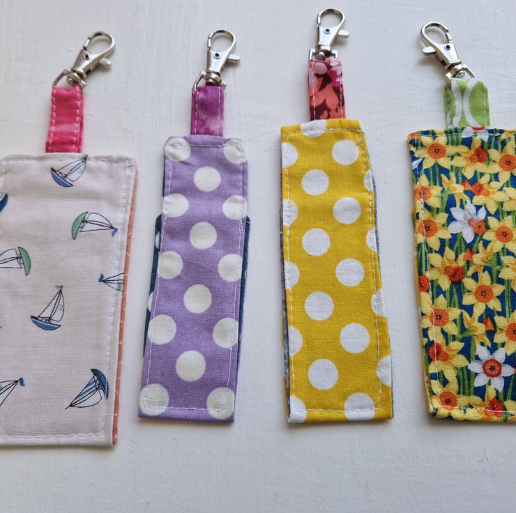 Lip balm holders (set of 4) are great to keep your lipstick or balms in one place. They have a metallic clasp which can be hooked onto a zip.