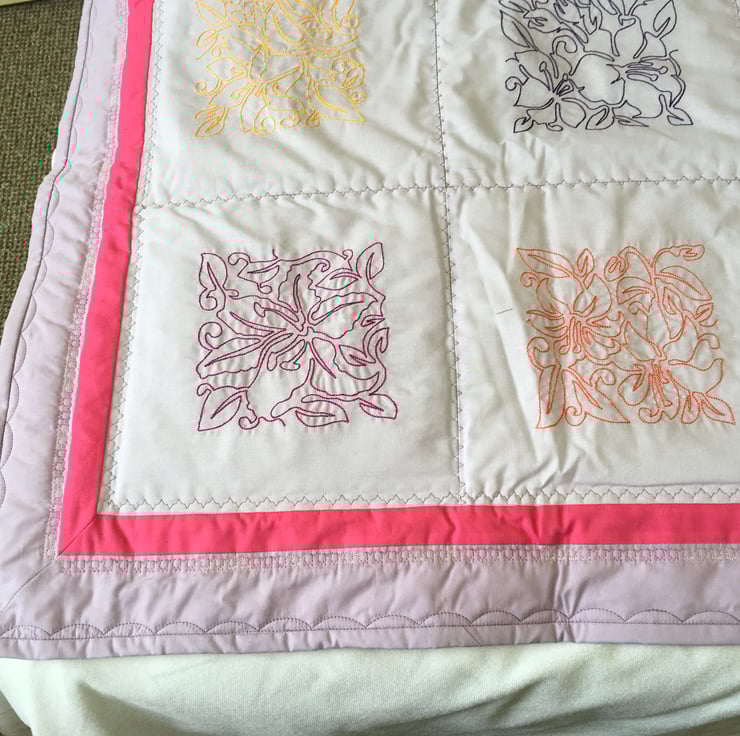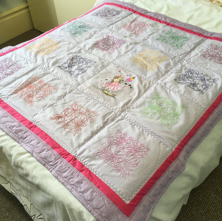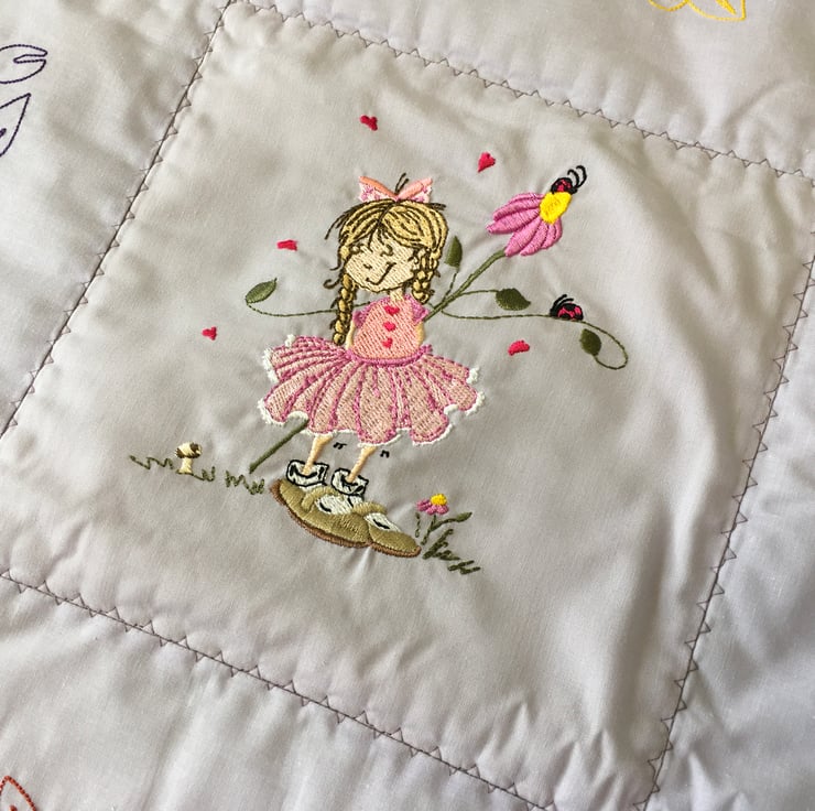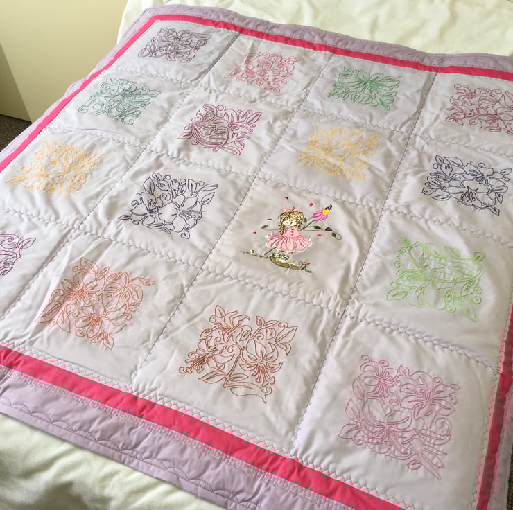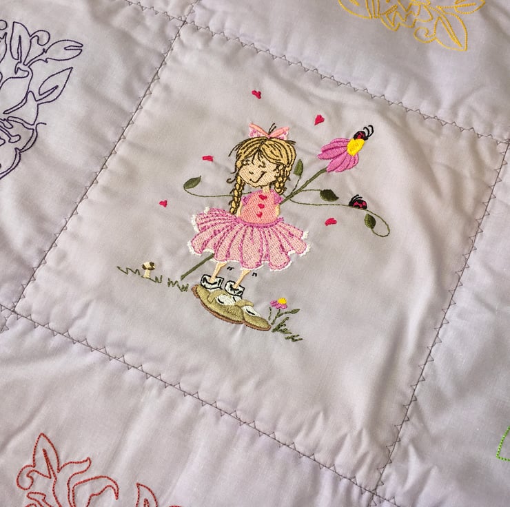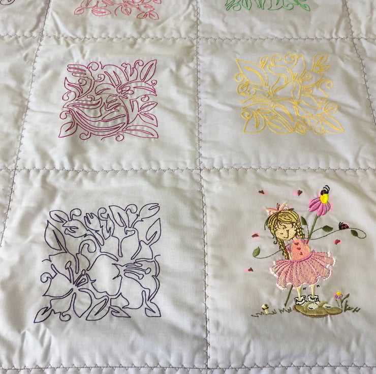 A nice-sized quilt with blocks decorated with different coloured threads in what is called Single Line embroidery as it’s like drawing a pattern without taking your pencil off the paper. These patterns are showing Lilies and leaves with a different off-centre block. This is a cute little girl in a flouncy pink dress holding a Daisy with a Ladybird hanging on for dear life. There’s even a little mushroom ! This quilt measures 41” square and is machine washable at thirty degrees