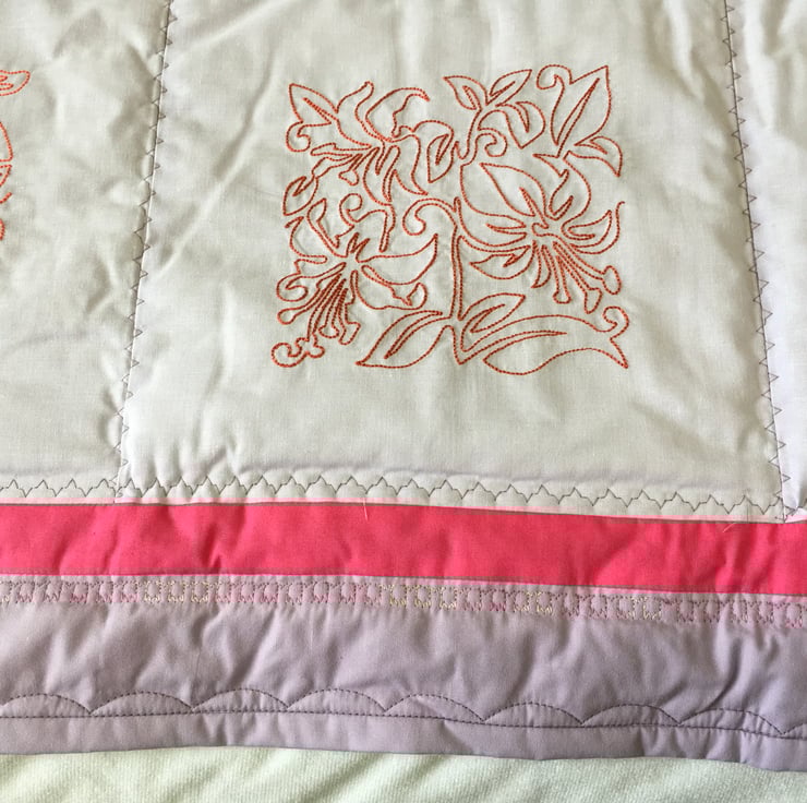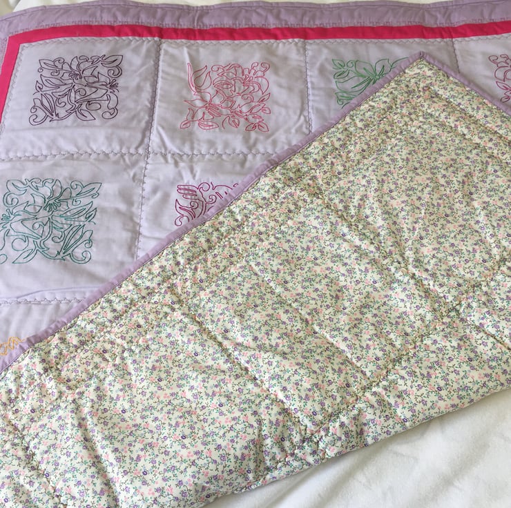 Single Bed or Lap Quilt. Floral Stitching Designs, Gift for Lady or Young Girl.