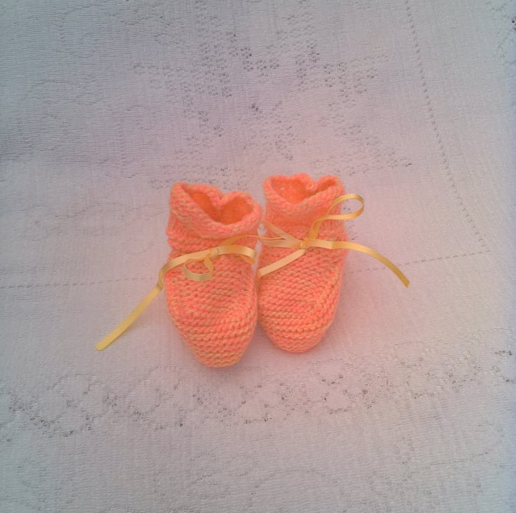 Baby's knitted boots made with peach and yellow double knitting yarn made to fit a 0 - 6 months old baby boy or a girl. They would make an ideal gift for a birthday, baby shower, new baby or just as something to for your little ones to wear.