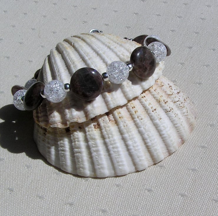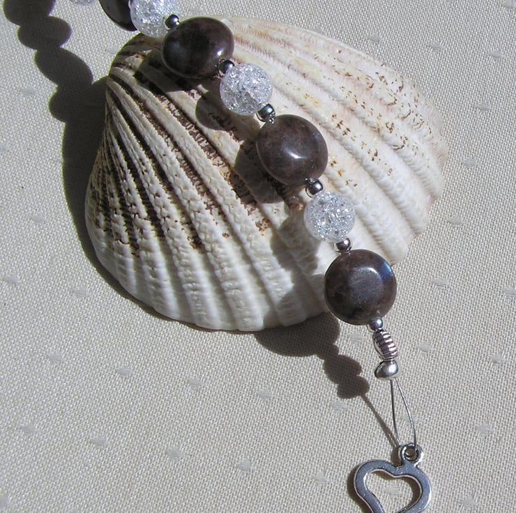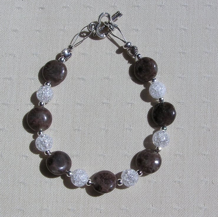 This Stunning Bracelet is made from Brown Labradorite coin-shaped Beads separated by Crackled Clear Quartz round beads with a tiny Silver Heart at each end - a Beautiful combination that will look stunning either worn casually or with something more Elegant for a Special Evening out