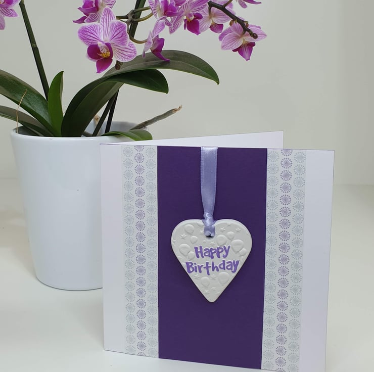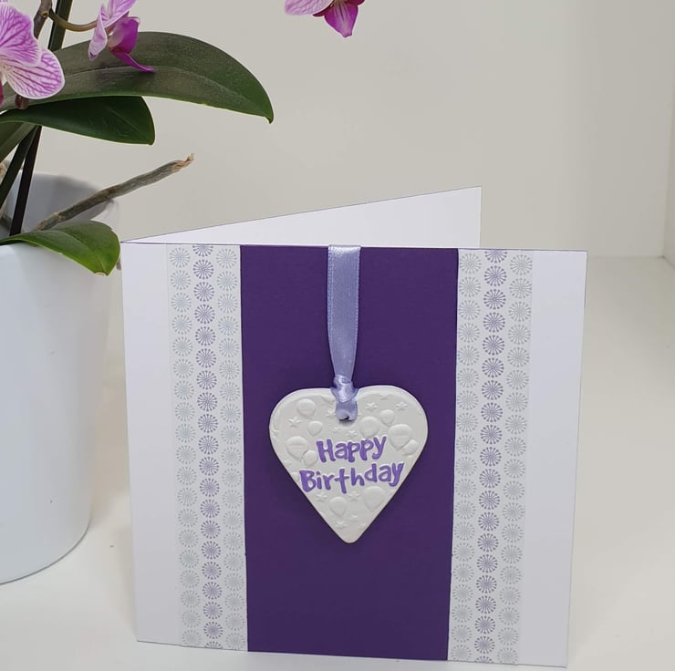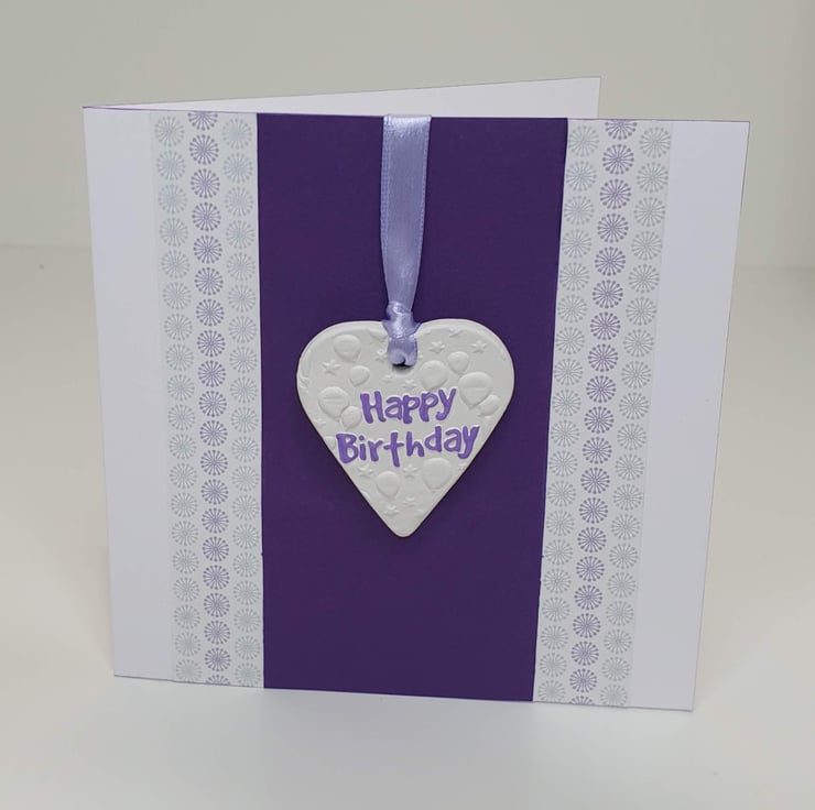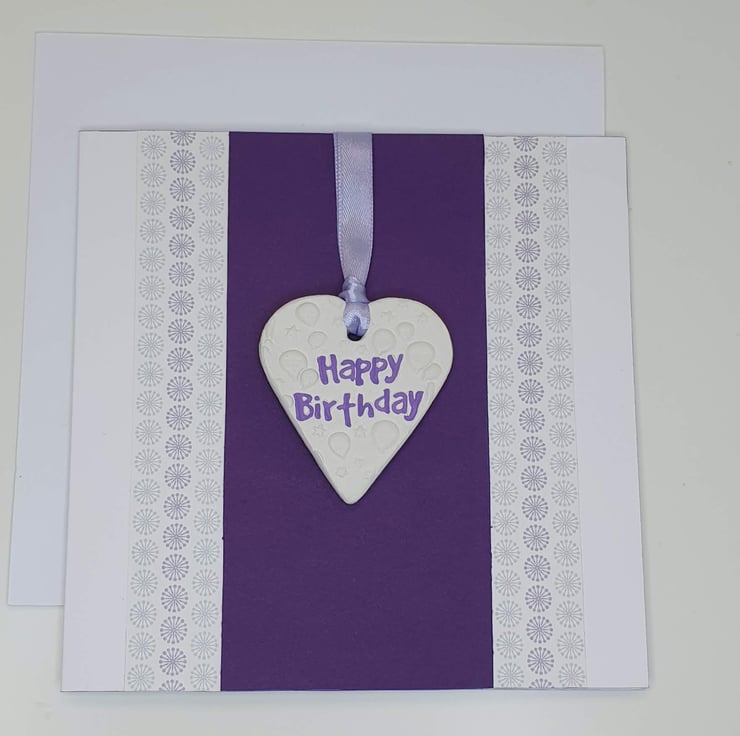 A lovely handmade birthday card with a detachable white clay heart keepsake. Perfect for a special birthday the handcrafted clay heart has been lovingly made from air dry clay and embossed with balloons and stars and the words happy birthday which are also embossed and painted with purple acrylic. This square white card has been decorated with purple card and decorative patterned white, purple and pale green paper. The clay heart can be kept as a keepsake and is easily removed and comes ready to hang from lilac satin ribbon . The heart has been left unsealed so you could add a few words to the back using a pen or pencil should you choose.