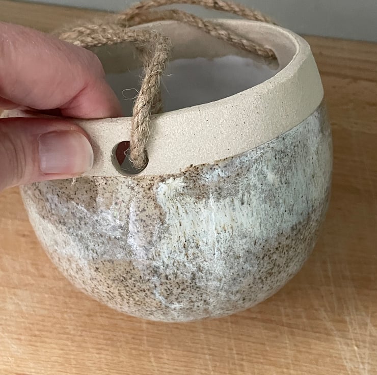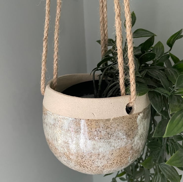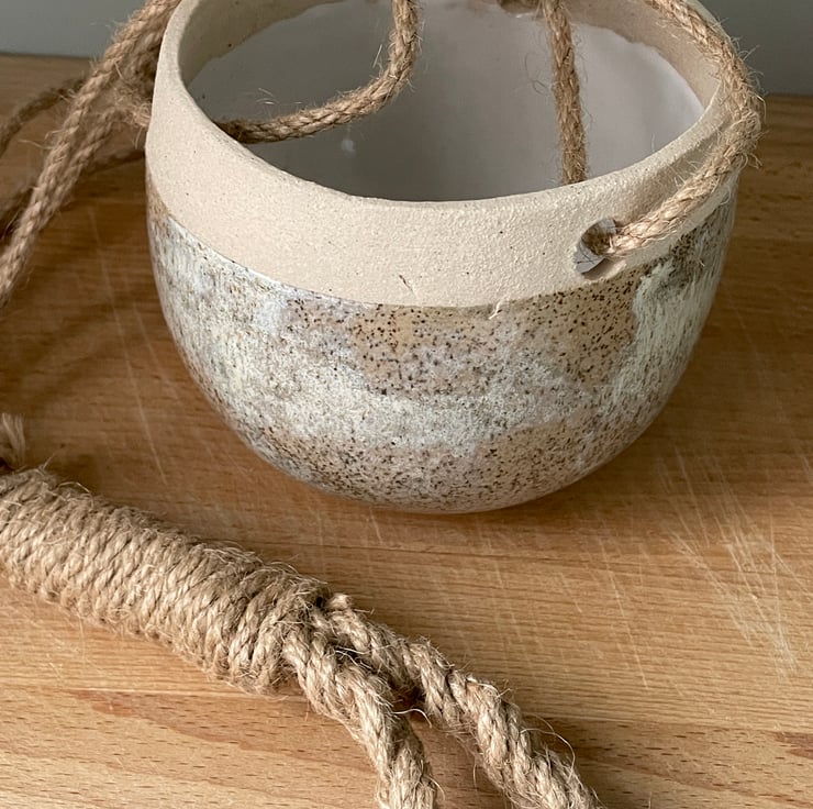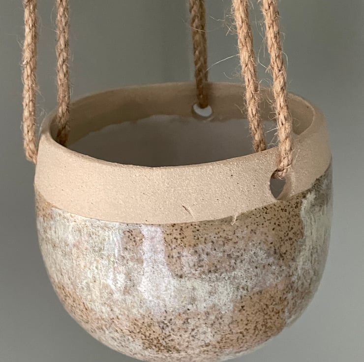 Unusual handcrafted hanging planter. This is a lovely handmade hanging plant pot, just the right size for a 9cm wide plant pot.
