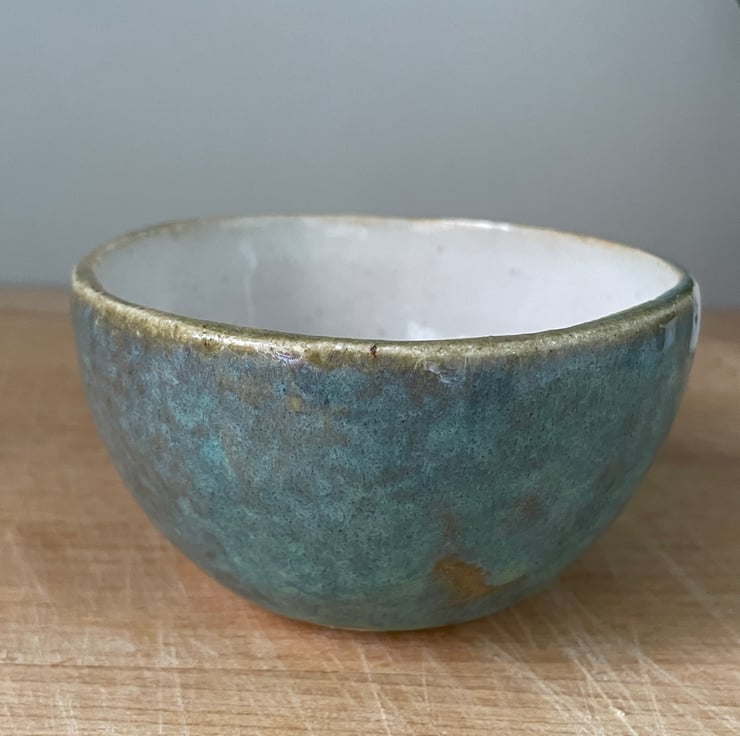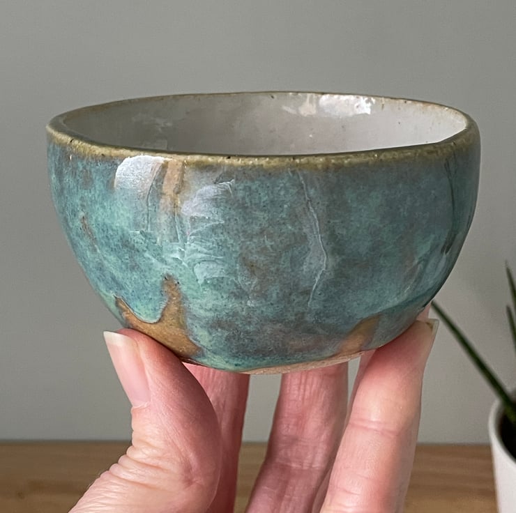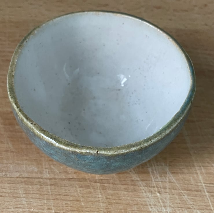 This has been entirely handcrafted by pinching the clay to form the final shape. This means that each dish bears the marks of a handmade piece complete with thumb and fingerprints. The dish has been fired twice, the second firing with a mix of glazes to create a beautiful flowing pattern. The inside of the dish has been glazed white.