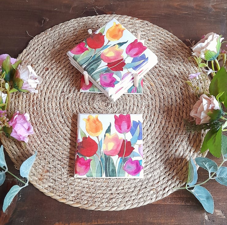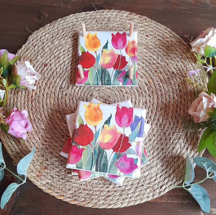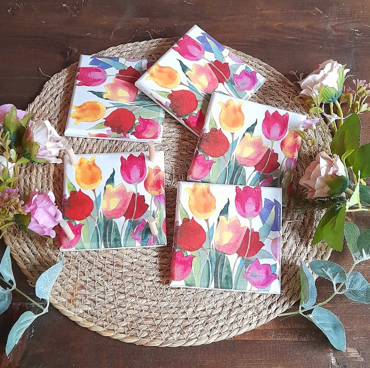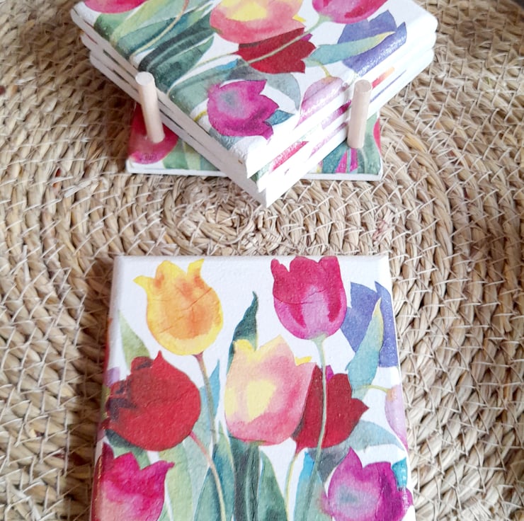 Wooden MDF Coasters painted then decoupaged with pretty Tulip.