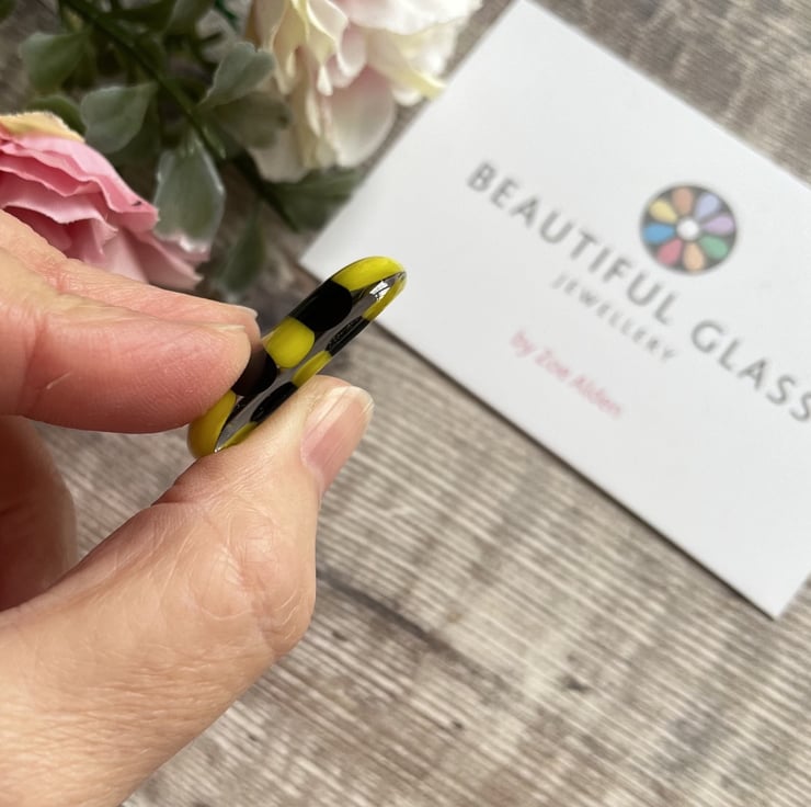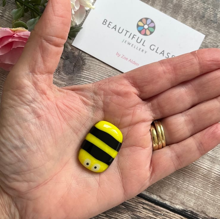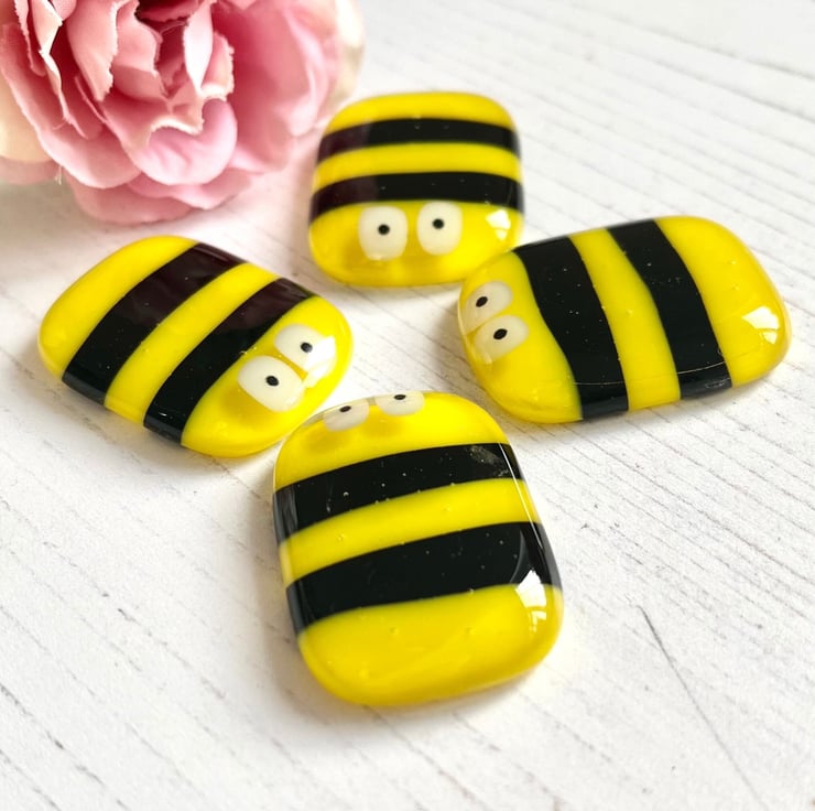I have individually made each bee by cutting tiny pieces of glass and fusing them together in my kiln, so each one is unique and may differ slightly from the photo. It has been glued onto a piece of white card with a choice of one of the messages from the drop-down menu. (The message on the first photo is one of the choices, it is NOT shown on each card)