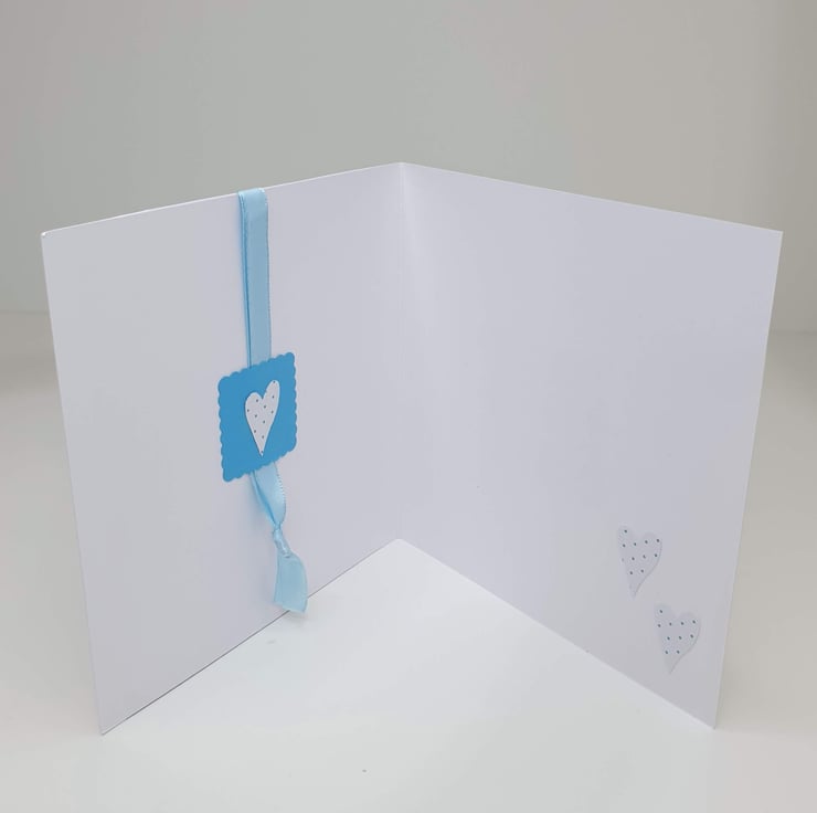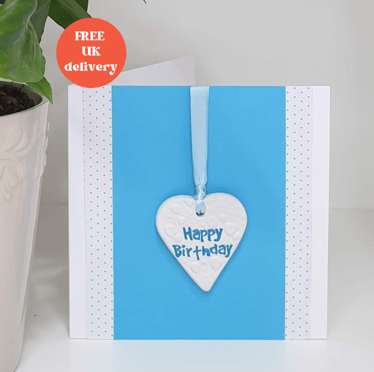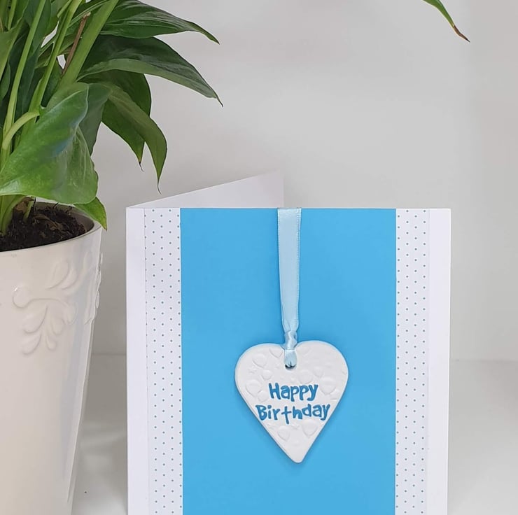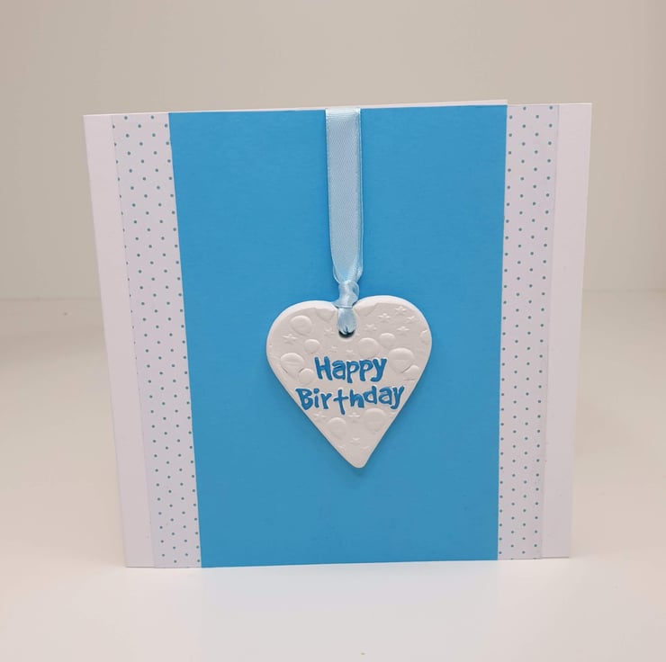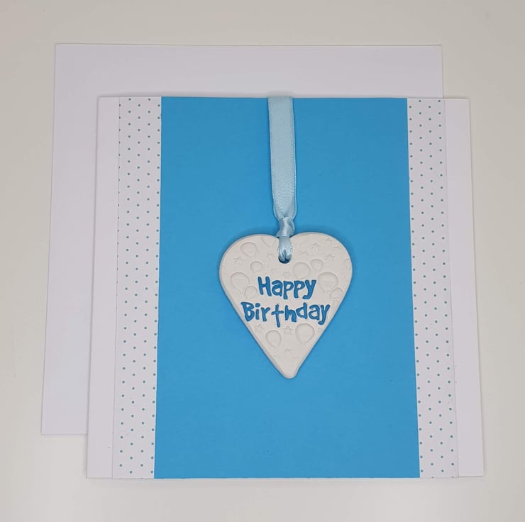 Decorative handmade card with a detachable white heart which has been handcrafted from air dry clay and embossed with balloons, stars and the words happy birthday which are painted with bright blue acrylic. This square white greetings card has been decorated with blue card and decorative paper featuring bright blue polka dots. The clay keepsake heart can be easily removed and comes ready to hang from pale blue satin ribbon . The heart has been left unsealed so you could add a few words to the back using a pen or pencil should you choose.