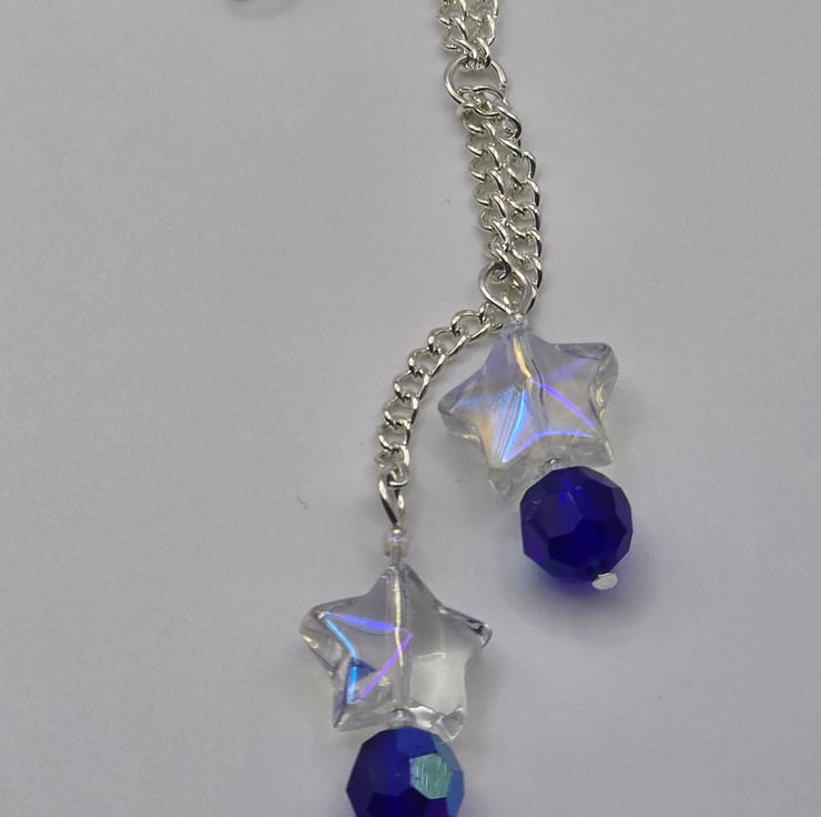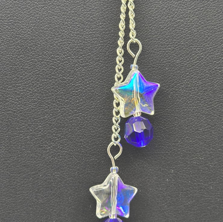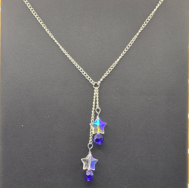 The necklace is made using a silver chain. The chain is joined in the centre using a jump ring which has 2 chains coming down of different lengths. The end of each chain contains a dark blue faceted glass bead and a clear crystal glass star above it.