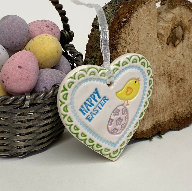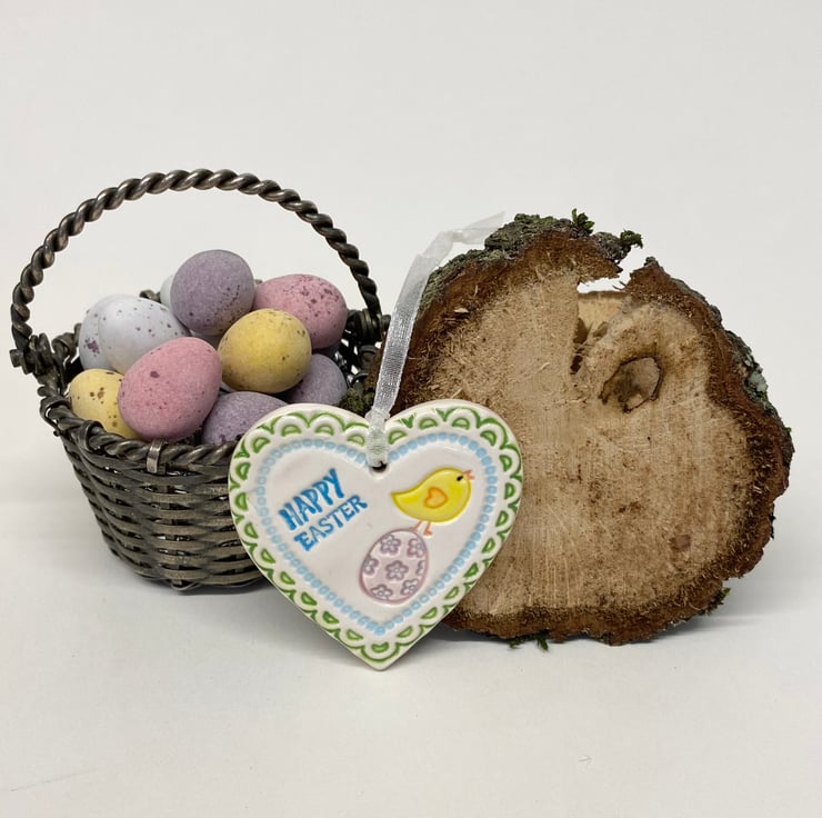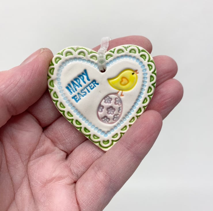 This little ceramic heart is made from white earthenware clay and imprinted with pattern. This has been fired in an electric pottery kiln, so it is nice and strong. It measures 4cm x 4cm and hangs from a matching cream organza ribbon. It is glazed on the front and left plain on the back.