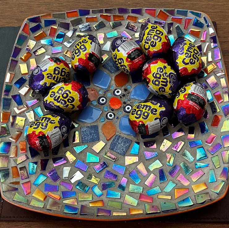 A Colourful mix of Mosaic enhances this plate with the classic Millifiore Bead or Evil Eye as the central attraction, used to ward off evil Intentions.