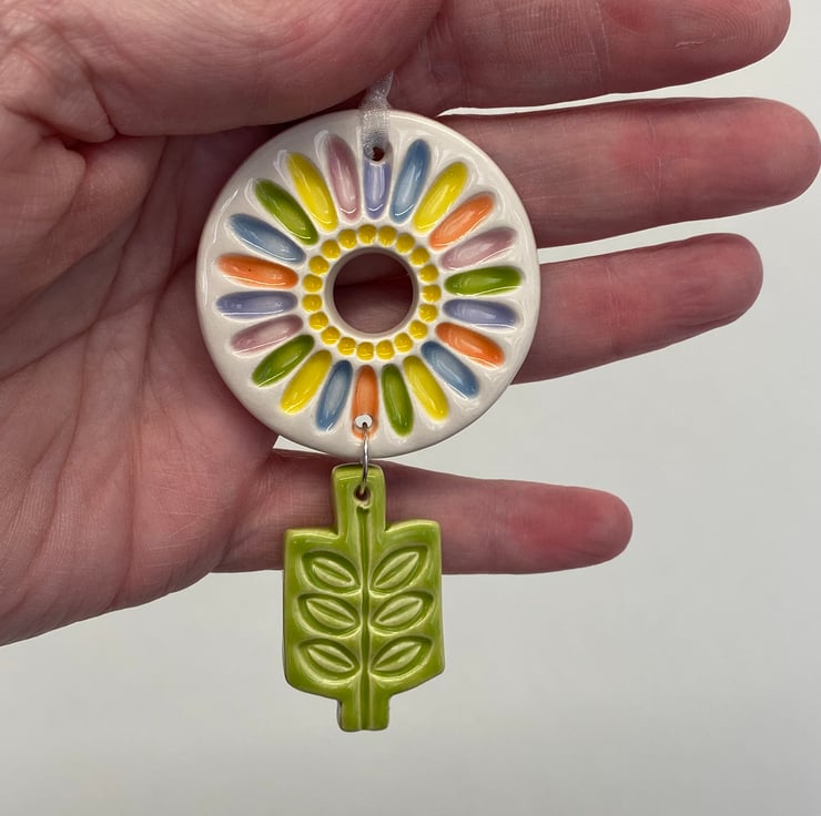 This flower deoration is made from white earthenware clay, imprinted with pattern and finished with a bright, glossy glaze. It has been fired twice, once to the bisque stage and then a second firing for the glaze. It measures 10 centimetres high x 5.5cm wide x 5mm thick.