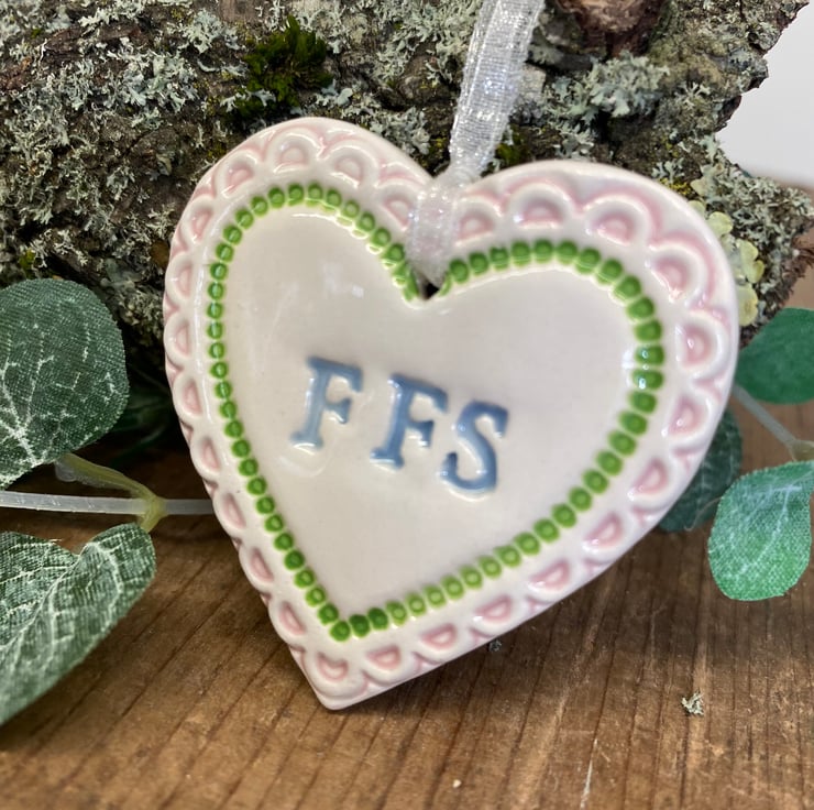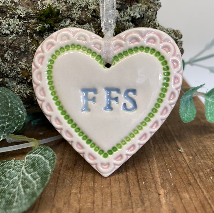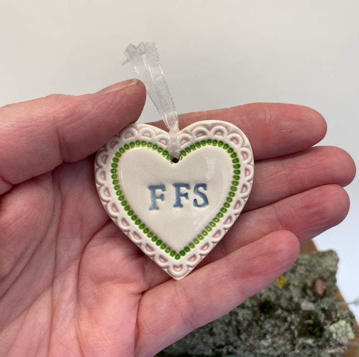 This little heart is made from white earthenware clay, imprinted with the letters FFS. The perfect gift to let someone know how much you love them! Some of the letters may be a bit higgledy piggledy but they have been stamped with love! It has been fired twice, once to the bisque stage and then a second firing for the clear glaze. It measures 4.5 centimetres wide x 5cm height x 5mm thick. It can be hung outside. (The last photo is to give you an idea of size and will not be the heart that you receive)