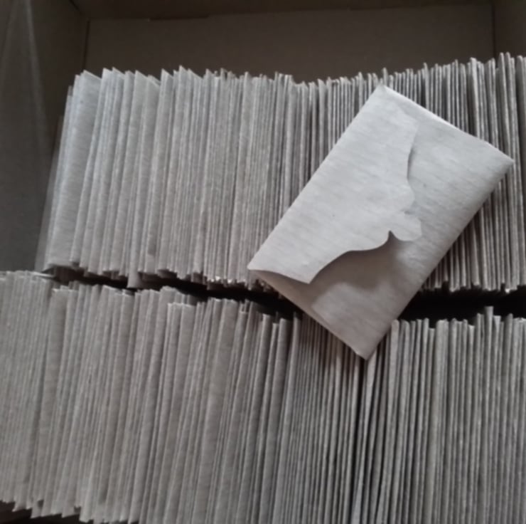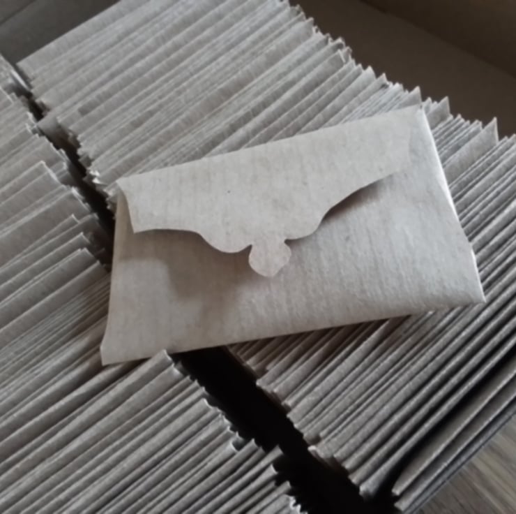 A huge pack of hand cut, hand drawn brown paper envelopes.