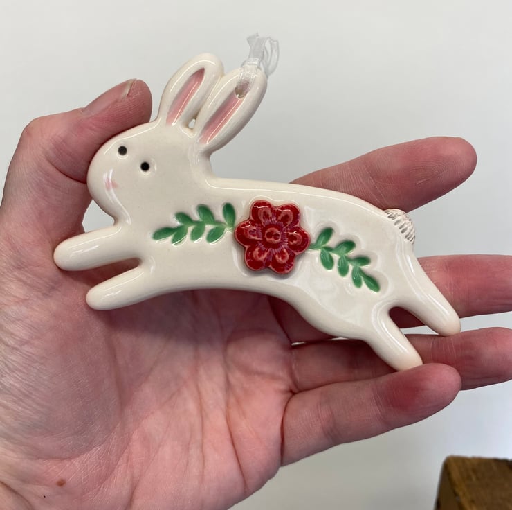 This little bunny is made from white earthenware clay and imprinted with a floral design in gorgeous Spring colours. This has been fired in an electric pottery kiln, so it is nice and strong. It measures 11cm x 6.5cm and hangs from a matching cream organza ribbon. It is glazed on the front and left plain on the back.