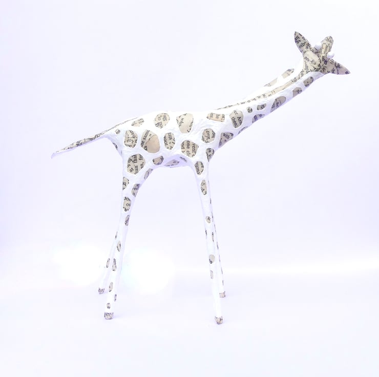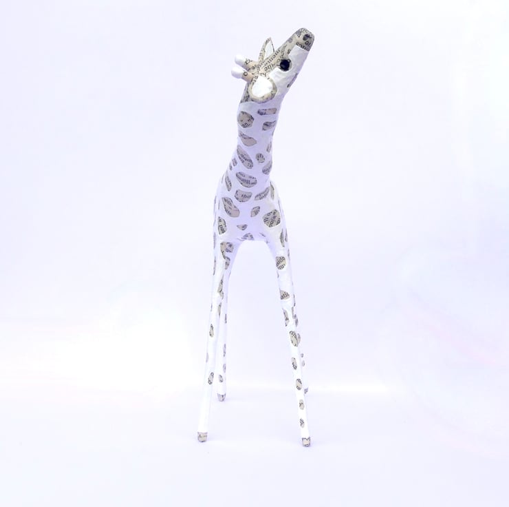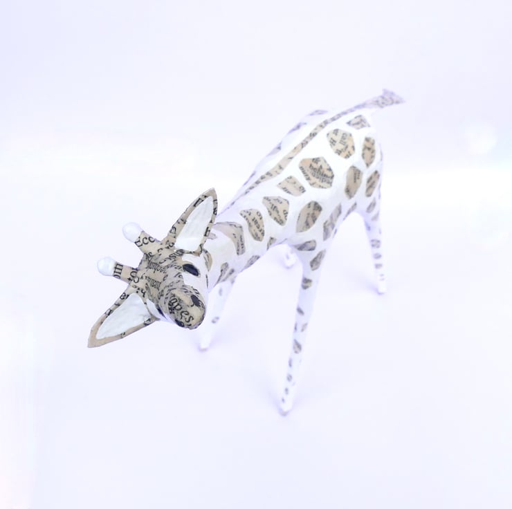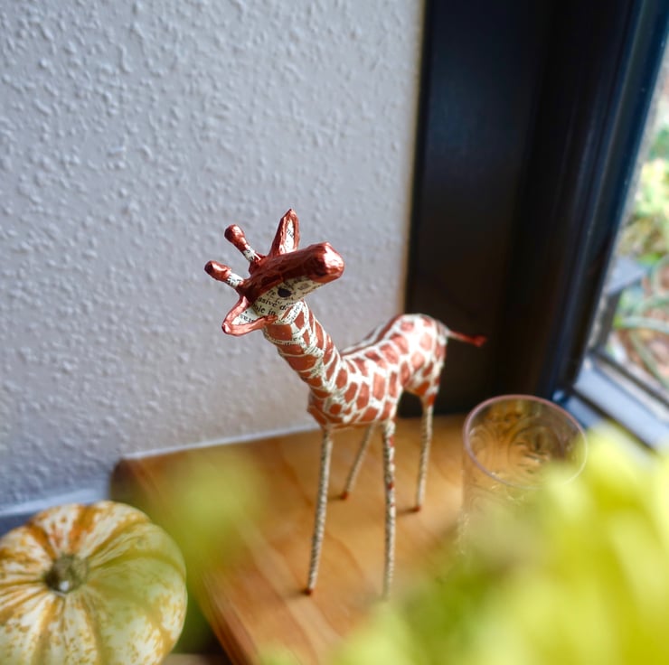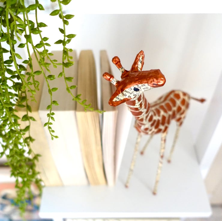 Looking for unique gifts? I created my little paper animals, hand made from recycled books, to decorate my home and bookshelves. They are intended to be three-dimensional "drawings" - I don't use any pattern or wire structure beneath the papier-mâché. Each one is therefore unique and has its own character. This little paper giraffe with hand-painted coat and expression is exactly the decoration I would love to have on my bookshelf in my home all year round. Ideal size for mantel or shelf decor.