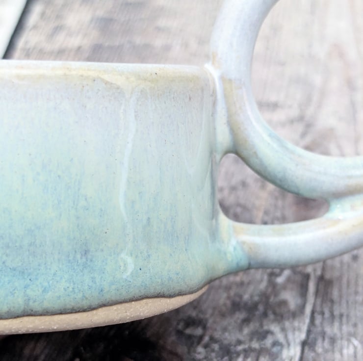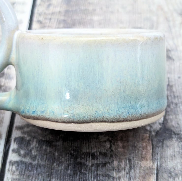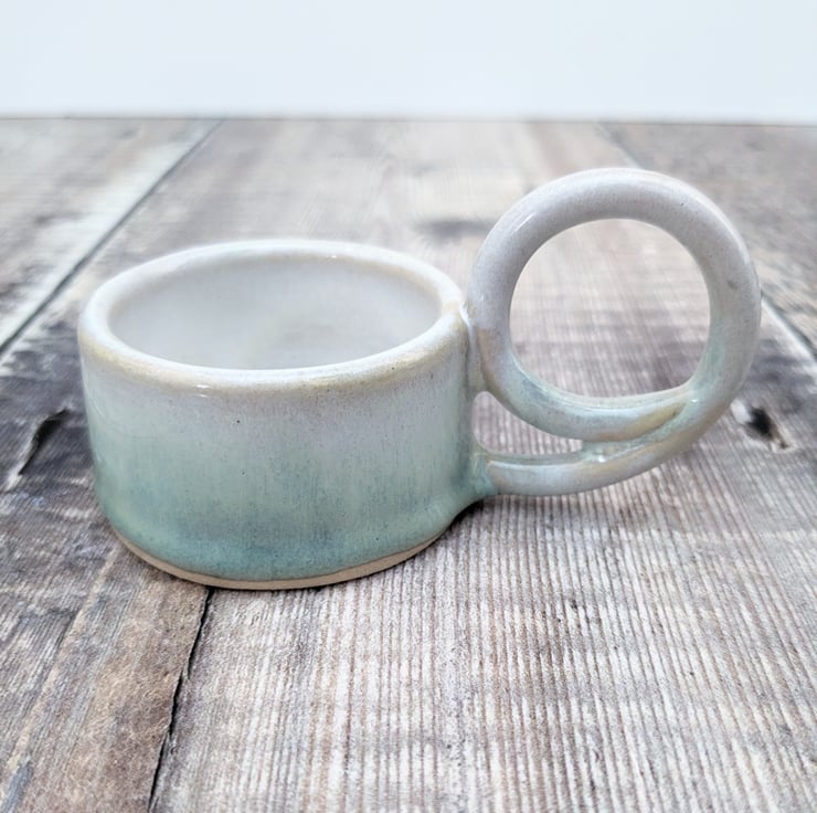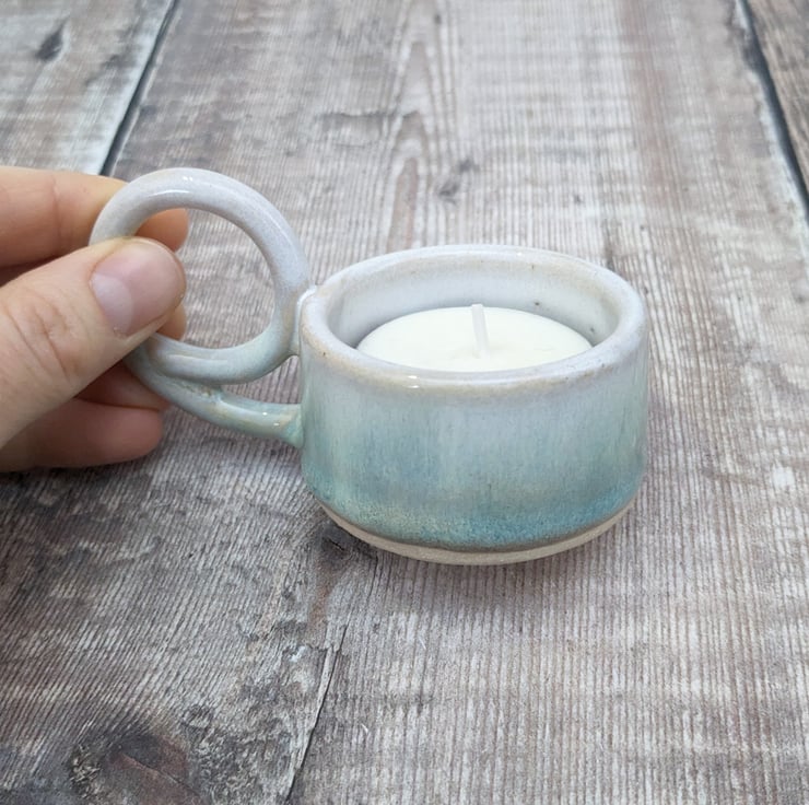 A ceramic tealight holder, wheel thrown in a light buff stoneware clay. A hand built handle is added on one side. It is glazed in an off white colour fading into turquoise on the outside. Hints of blue can be seen where the glaze begins to pool.