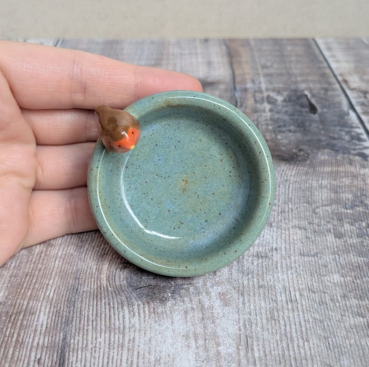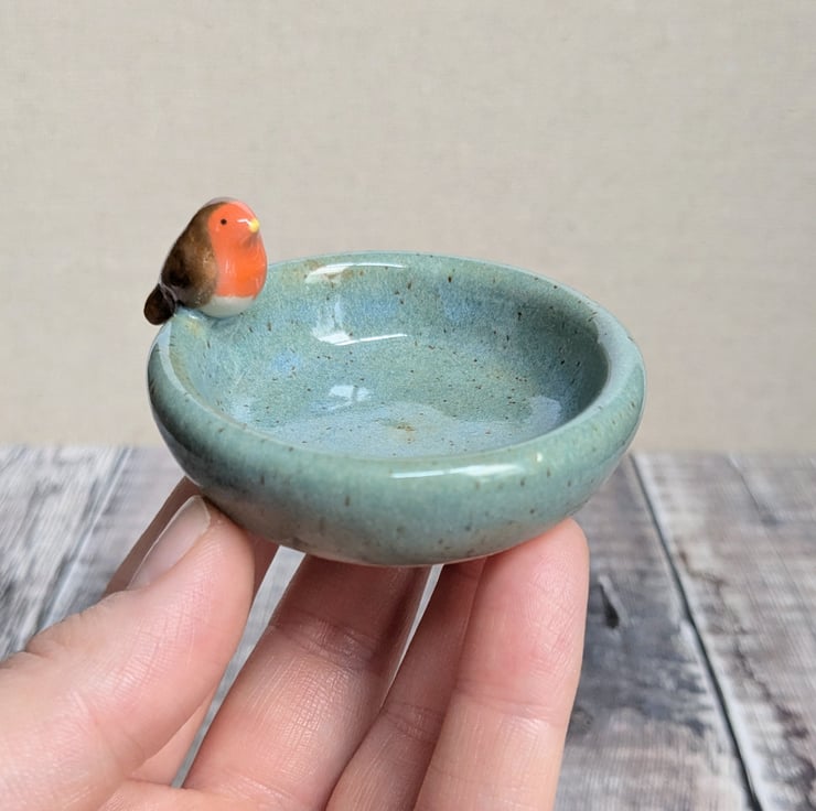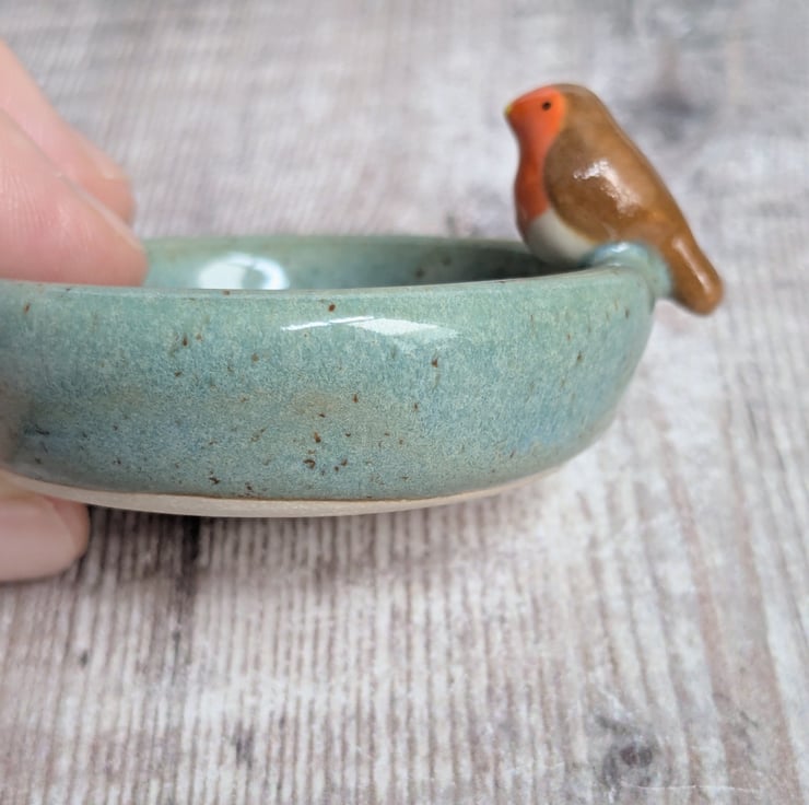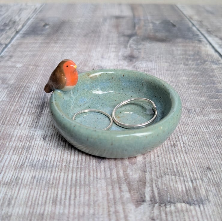 A small ceramic ring dish, wheel thrown in a white stoneware clay. A hand sculpted, hand painted robin perches on the rim. The dish is glazed in a turquoise glaze with a subtle brown speckle running through it.