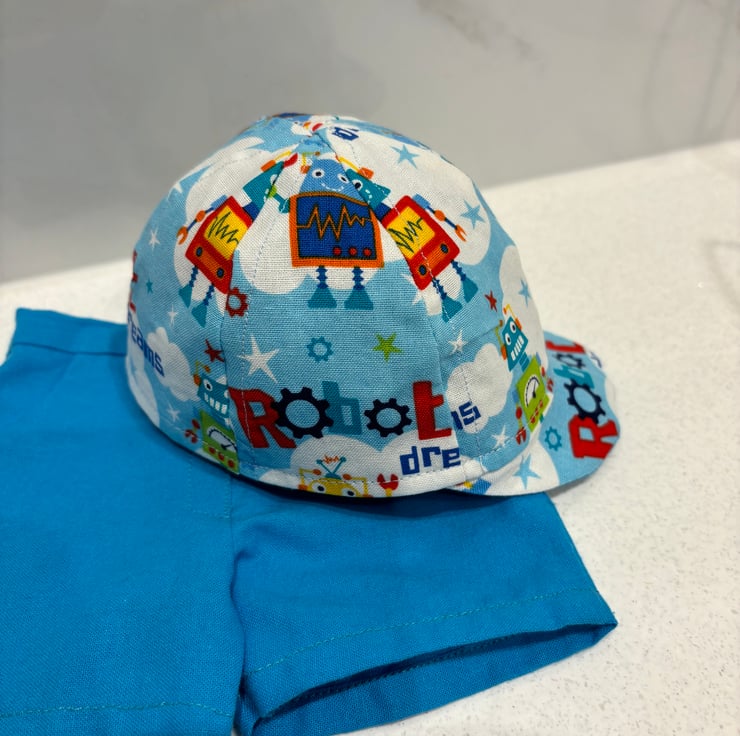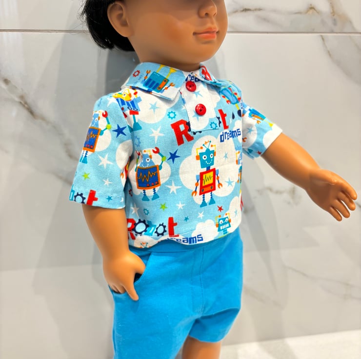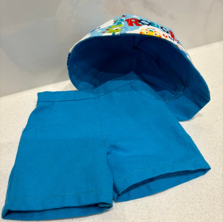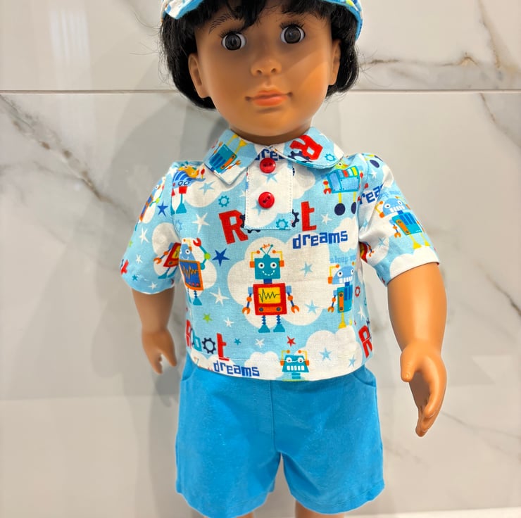 Boy doll outfit. Made to fit 18”/46cm dolls. Shorts with pockets at both sides. Light blue robot print top and matching baseball cap. The cap is lined in the same fabric as the top. So it all coordinates together.
