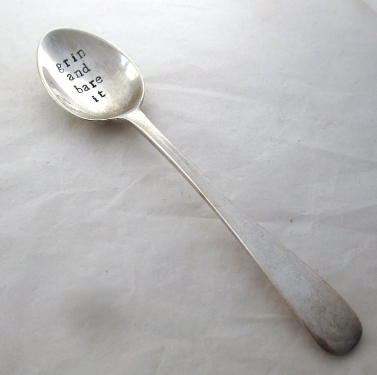 A cheeky little spoon hand stamped with 'grin and bare it' - the perfect gift for a naturist! It's a vintage silver-plated coffee spoon with a plain handle and it measures approx. 12.5cm long. The lettering is coloured with a non-toxic water-based ink. You will receive the spoon shown in the photos; please note it's vintage going on antique so it's not completely pristine and perfect, there are some wear marks and scratches. It will all the same give many years' service (and smiles) as a tea, coffee or general-purpose camping spoon.