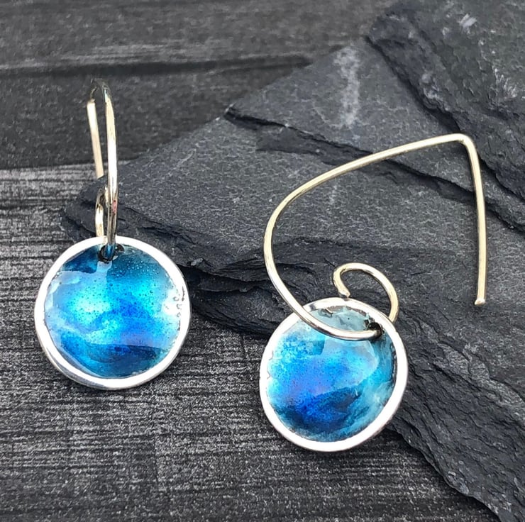 These Blue Enamel Earrings are made from Sterling Silver and beautiful blue enamels. Inspired by blue lagoons these handcrafted earrings are concave in shape. The circles which have a flat silver circumference measure approximately: 1.3cm in width and hang on Sterling Silver scroll hooks.
