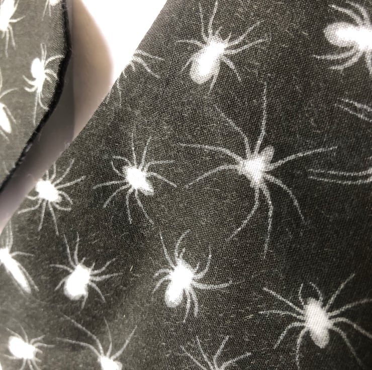 Due to pre-machine washing this fabric I discovered that it fades – hence the lower price – as you will see from some of the pictures. Hand wash only to preserve the colours. Air drying is recommended as creases will form in the dryer, where colour will fade. Air dry and cool iron. Fabric; glow in the dark spider, polyester cotton. It was hard to try and get a decent picture of the glow in the dark feature!