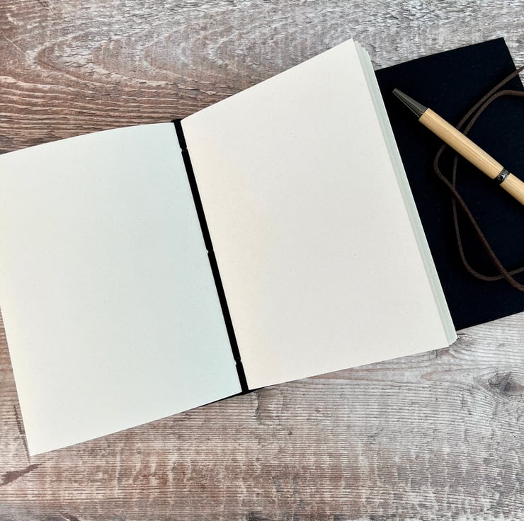 It is filled with 80 pages (160 sides) of high quality recycled paper, suitable for all writing and drawing mediums. It ties with a brown faux suede cord.
