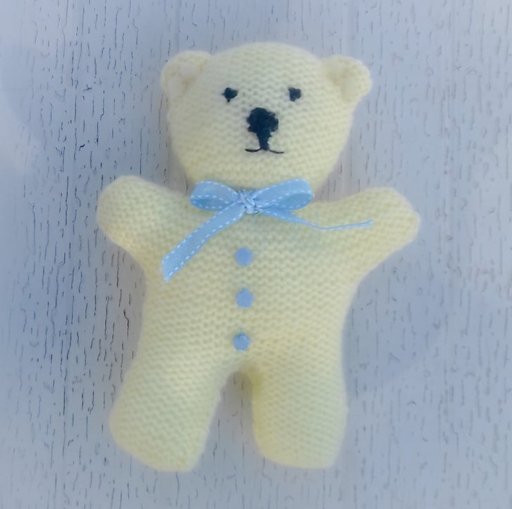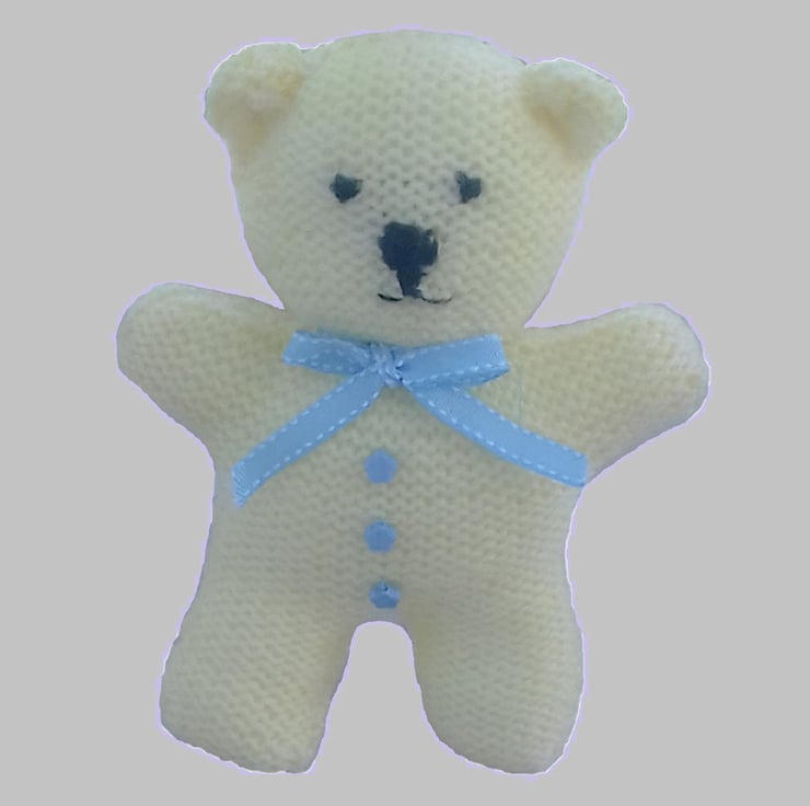 This hand knit PATTERN is for a knitted Teddy Bear toy. Finished size 20 cm or 8 inch. The teddy bear can be knitted in 4 ply, double knitting or chunky yarn. Remember to be safety conscious when knitting for a baby. If you are going to give the teddy to a new baby then maybe omit the ribbon and buttons. You could embroider embellishments instead.