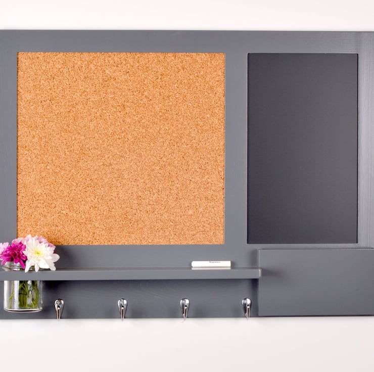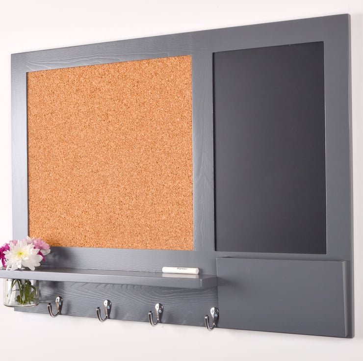 Chalkboard pin board organiser finished in a low sheen grey paint.