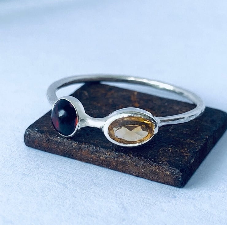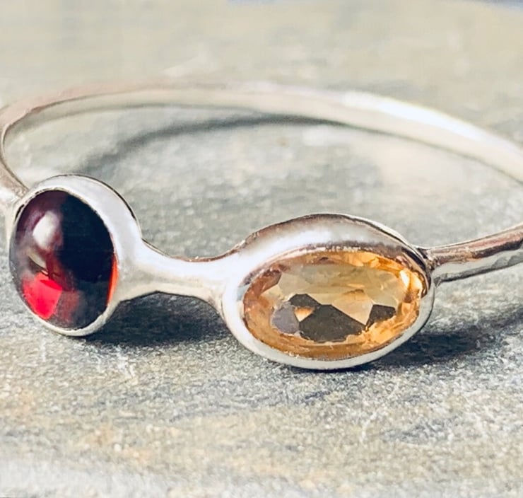 Skinny 1.2 mm round profile ring Featuring a 6 x 4 mm oval faceted citrine gemstone and a 5 mm round cabochon garnet.