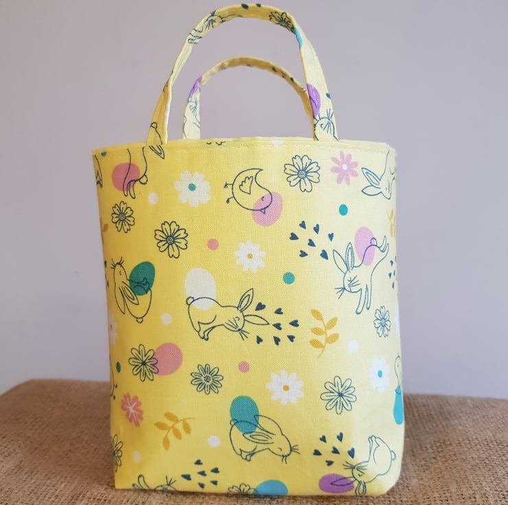 This lovely cotton fabric makes a great little gift bag. Just the right size for a pack of mini eggs. Use for an Easter egg hunt and keep for another year.