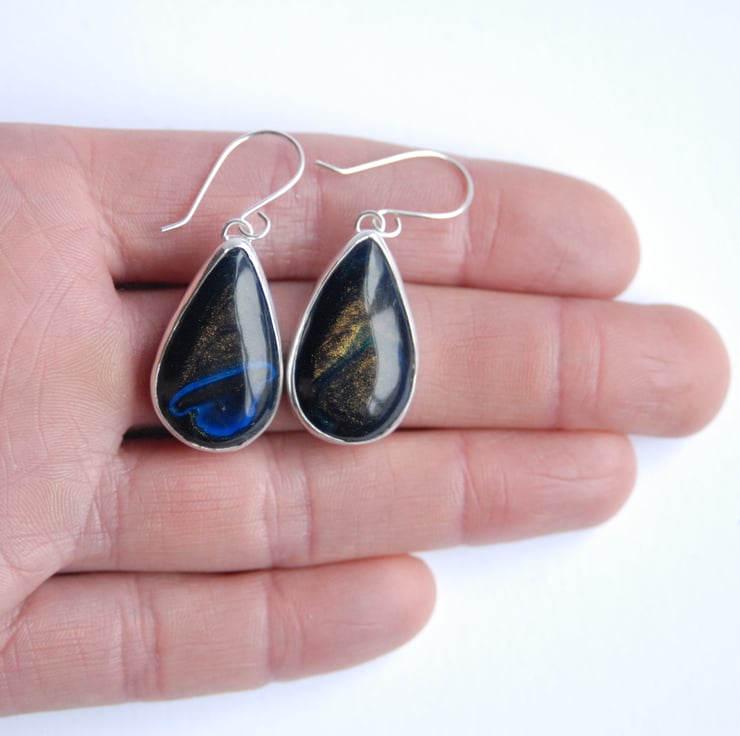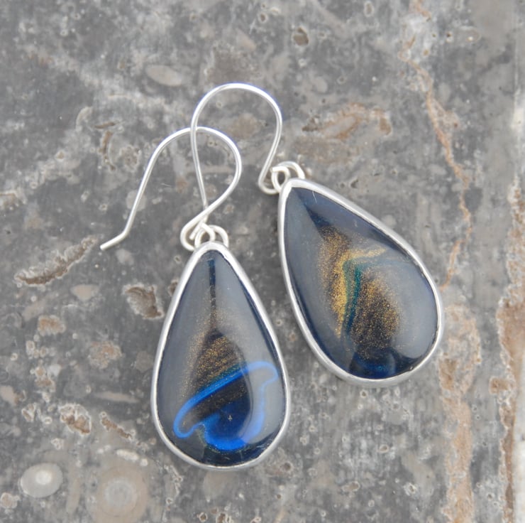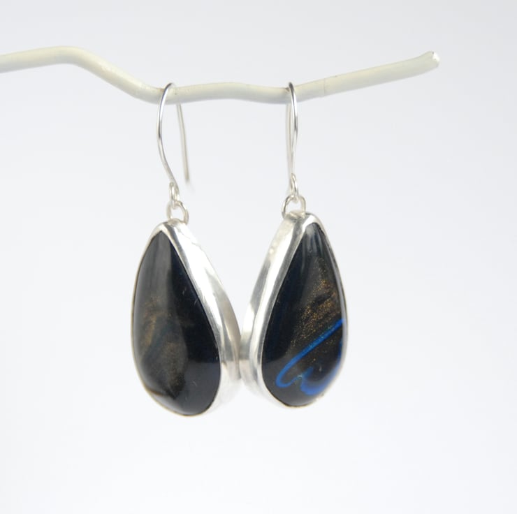 These classic drop earrings are given a modern twist by featuring sustainable bowlerite bezel set in recycled sterling silver. The bowlerite is a deep navy colour that is almost black (if I'm feeling fancy I'd call it ink) which has a golden shimmer running through it, one of the drops has a swirl of royal blue. The earrings measure approx 44mm drop (inc hooks) by 16mm, bowlerite is light weight so these would be comfortable to wear all day and into the night. Comes in a gift box.