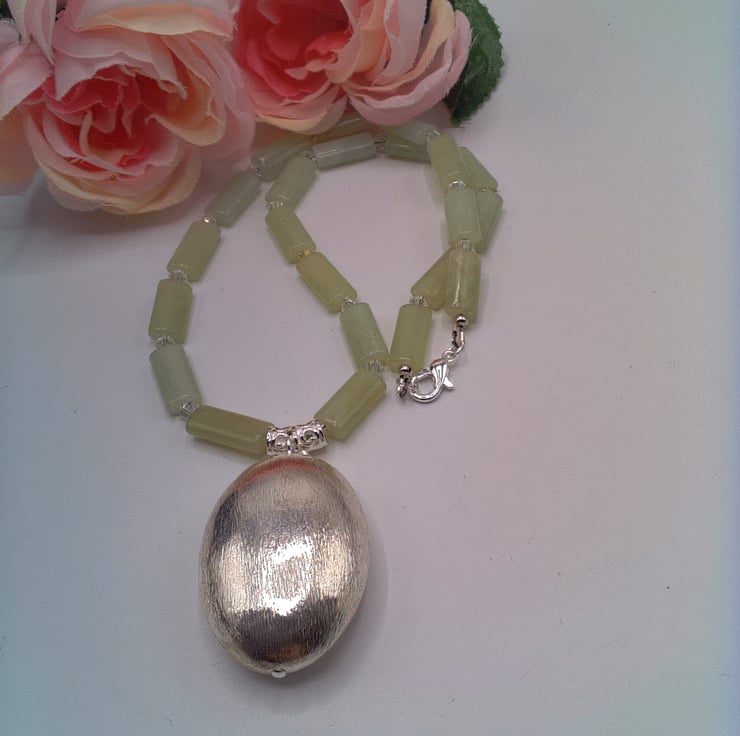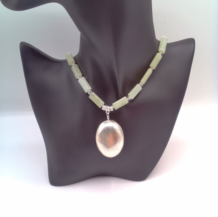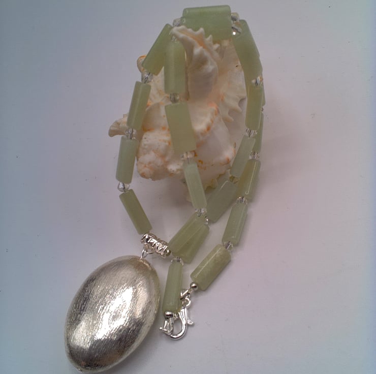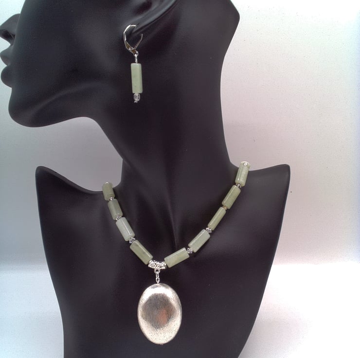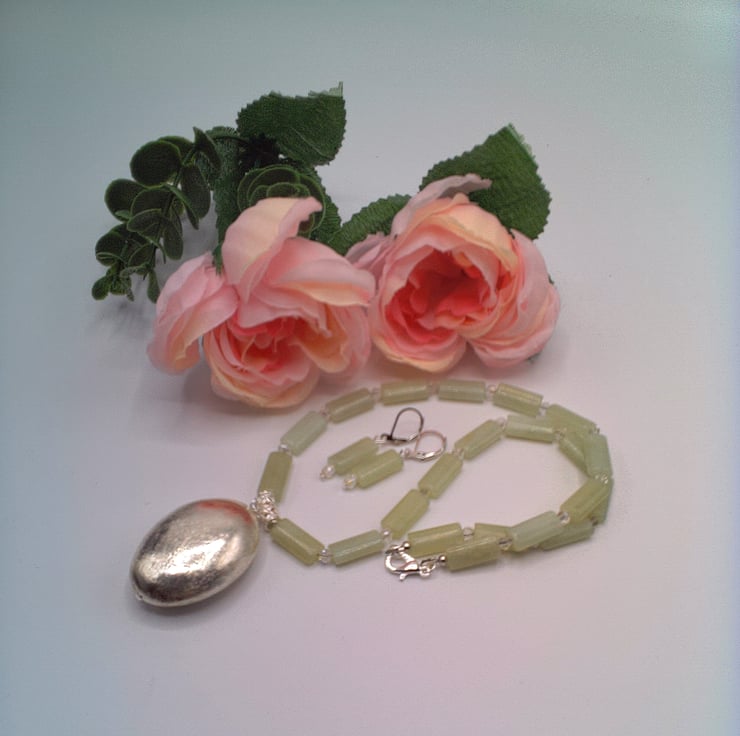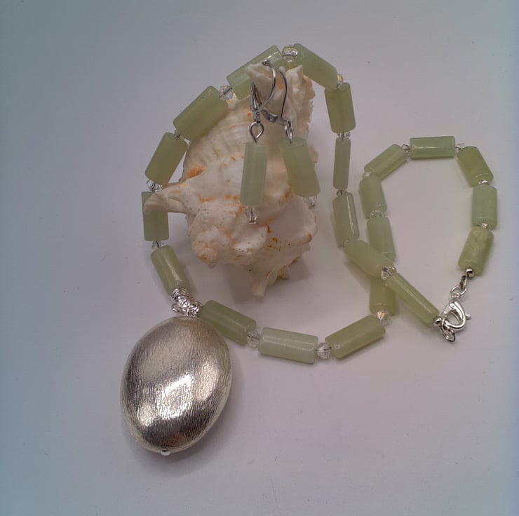 This stunning green jade bead and clear crystal jewellery set comprises a necklace with an oval silver pendant, and a pair of earrings. The necklace is made using 15 mm x 8 mm green puffed rectangular jade cubes and 4 mm clear crystal bicone beads with a gorgeous puffed brushed silver pendant, measuring 40 mm x 30 mm, at the centre. It is fastened with a silver plated lobster clasp.The earrings have the green puffed rectangular jade beads and crystal bicones used on the necklace, suspended on silver plated lever backs. The necklace is 18.5 inches (47.5 cm) in length, with a drop of 2 inches (5 cm) for the pendant and the earrings have a drop of 1 inch (2.5 cm) from the base of the ear stud. The jewellery set will be dispatched wrapped in tissue paper in an organza bag and delivered by Royal Mail first class post. The set would ideally suit a jewellery loving lady and it would look good for a special occasion, such as a wedding.
