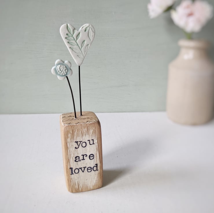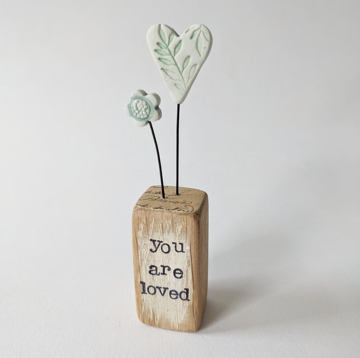 Clay Heart and Flower in a Printed Wood Block 'You are Loved'