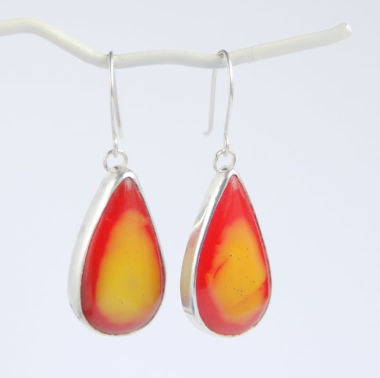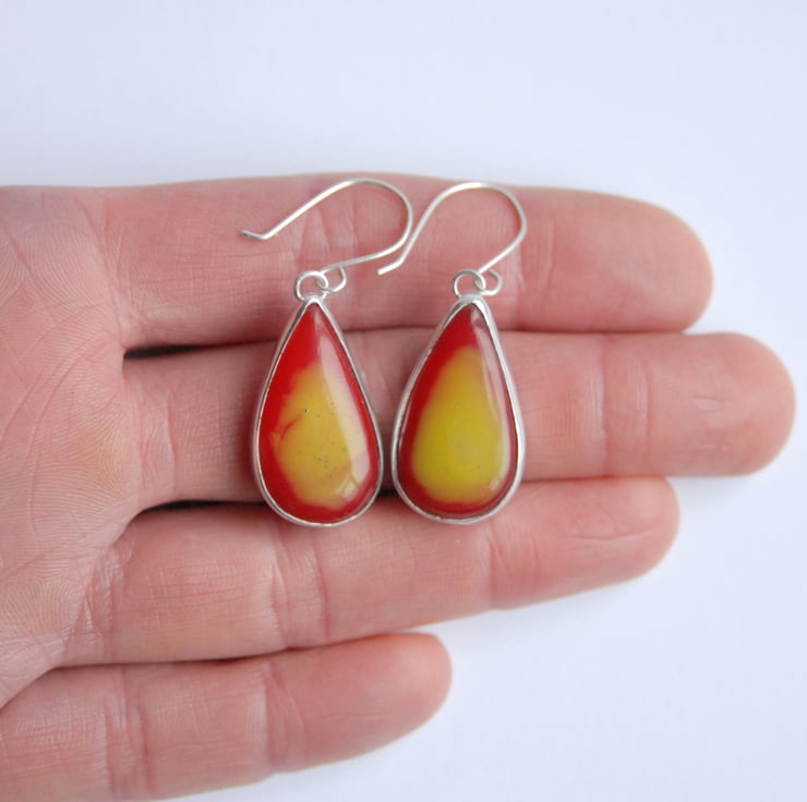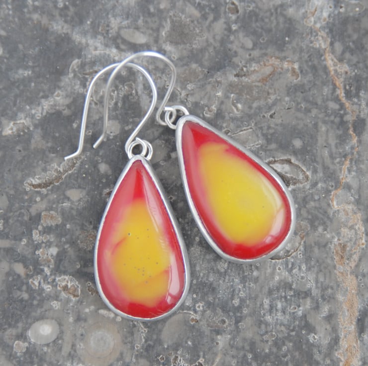 These vibrant drop earrings showcase eye catching bowlerite bezel set in recycled sterling silver, the earrings are then finished with simple hooks. This bowlerite is a bright raspberry red with a sunshine yellow center (they remind me of the rhubarb and custard boiled sweets I used to eat as a kid, it's that sort of colour combo). This bowlerite is slightly translucent so the colour comes to life in the sunshine. There are some dark speckles in the yellow, this is from air bubbles in the material. The earrings measure approx 44mm drop (inc hooks) by 16mm, bowlerite is light weight so these would be comfortable to wear all day and into the night. Comes in a gift box.