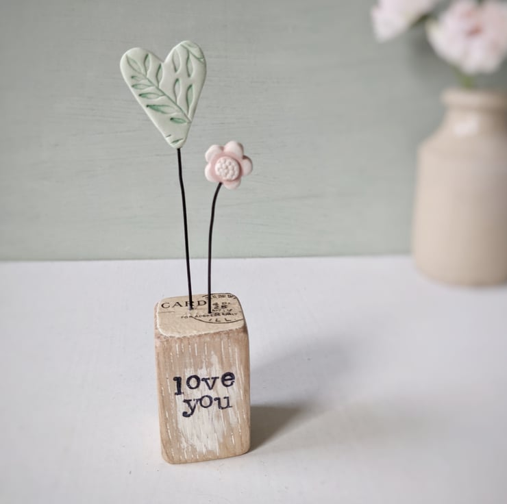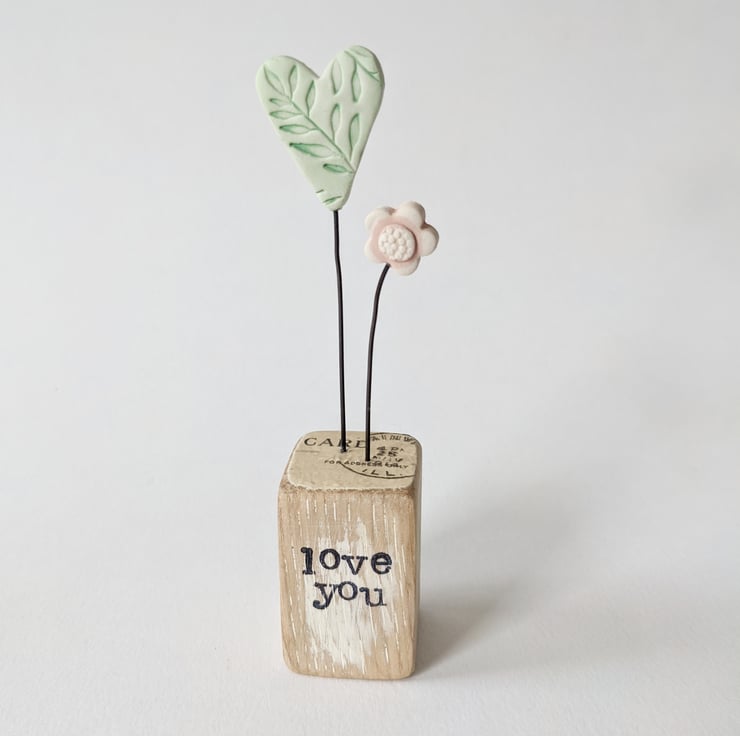 A little clay heart stands on a wire stalk in a sanded and stamped wooden block.