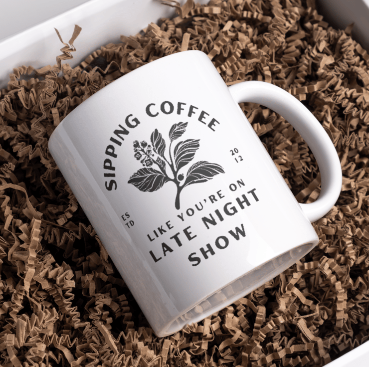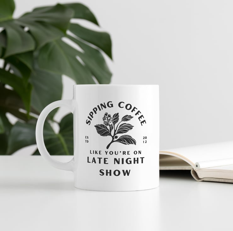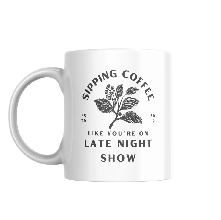 Elevate your coffee routine with our charming ceramic mug! It showcases the message "Sipping Coffee Like You're on a Late Night Show". The perfect lyric inspired gift.